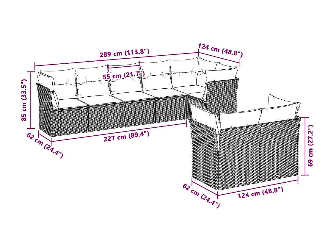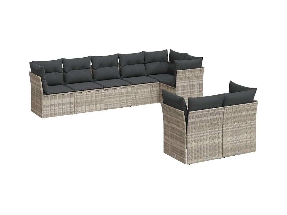 8 peças conj. sofás jardim com almofadões vime PE cinzento-claro