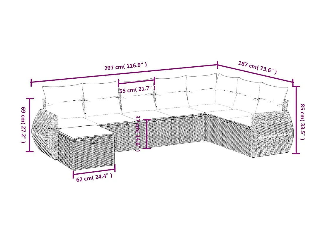 8 peças conj. sofás jardim com almofadões vime PE cinzento-claro