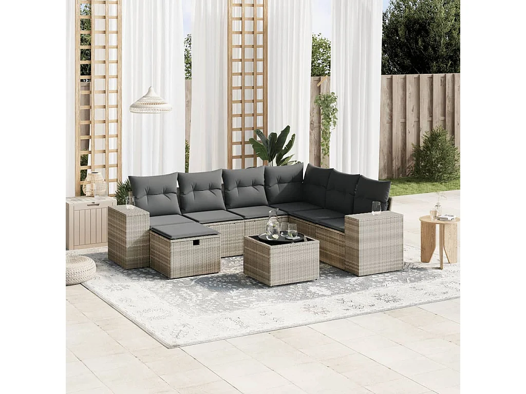 9 peças conj. sofás jardim com almofadões vime PE cinzento-claro
