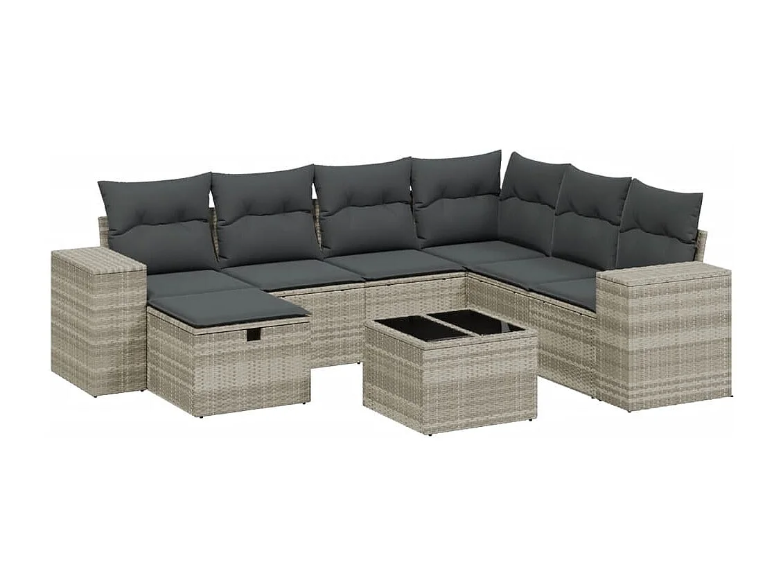 8 peças conj. sofás jardim com almofadões vime PE cinzento-claro