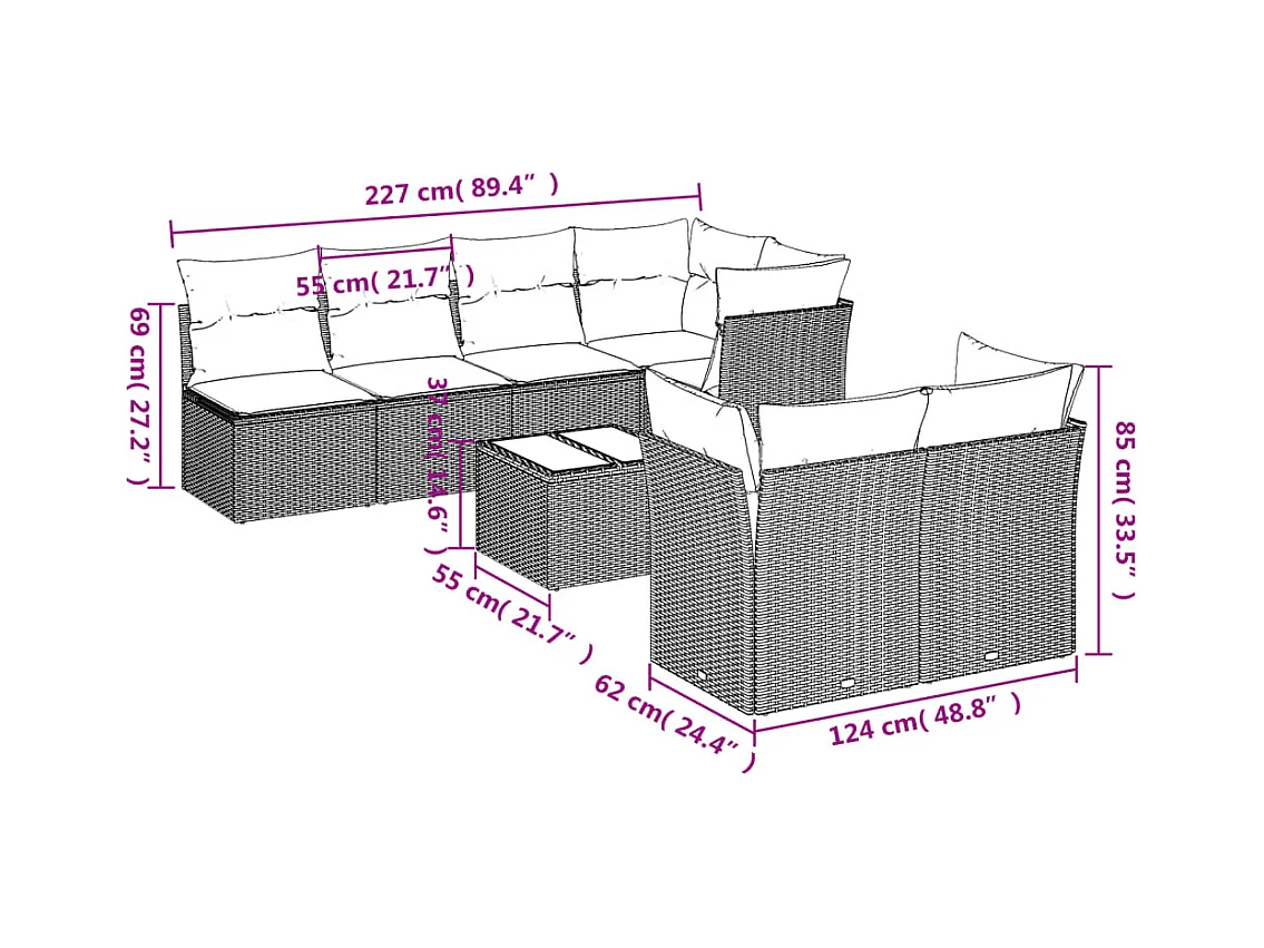 8 peças conjunto sofás jardim almofadões vime PE/acácia cinzento