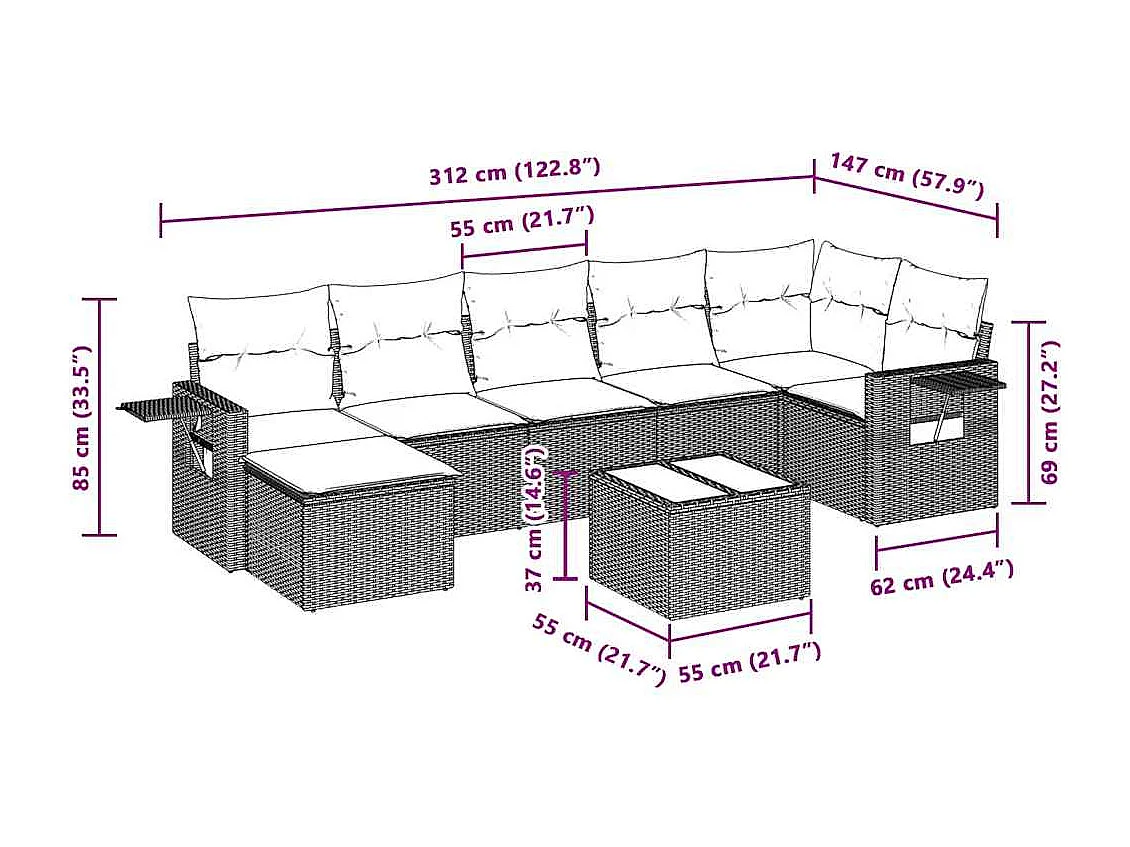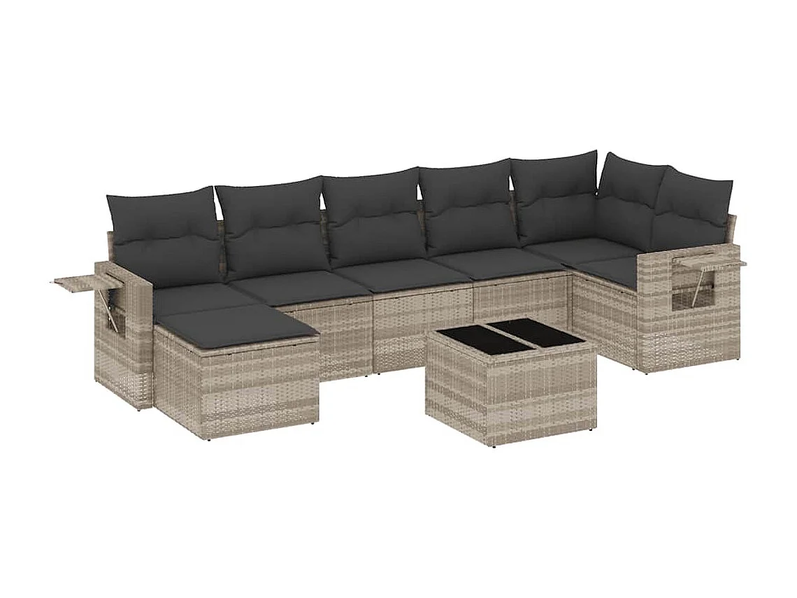 8 peças conj. sofás jardim com almofadões vime PE cinzento-claro