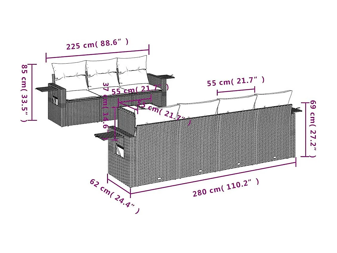 8 peças conj. sofás jardim com almofadões vime PE cinzento-claro