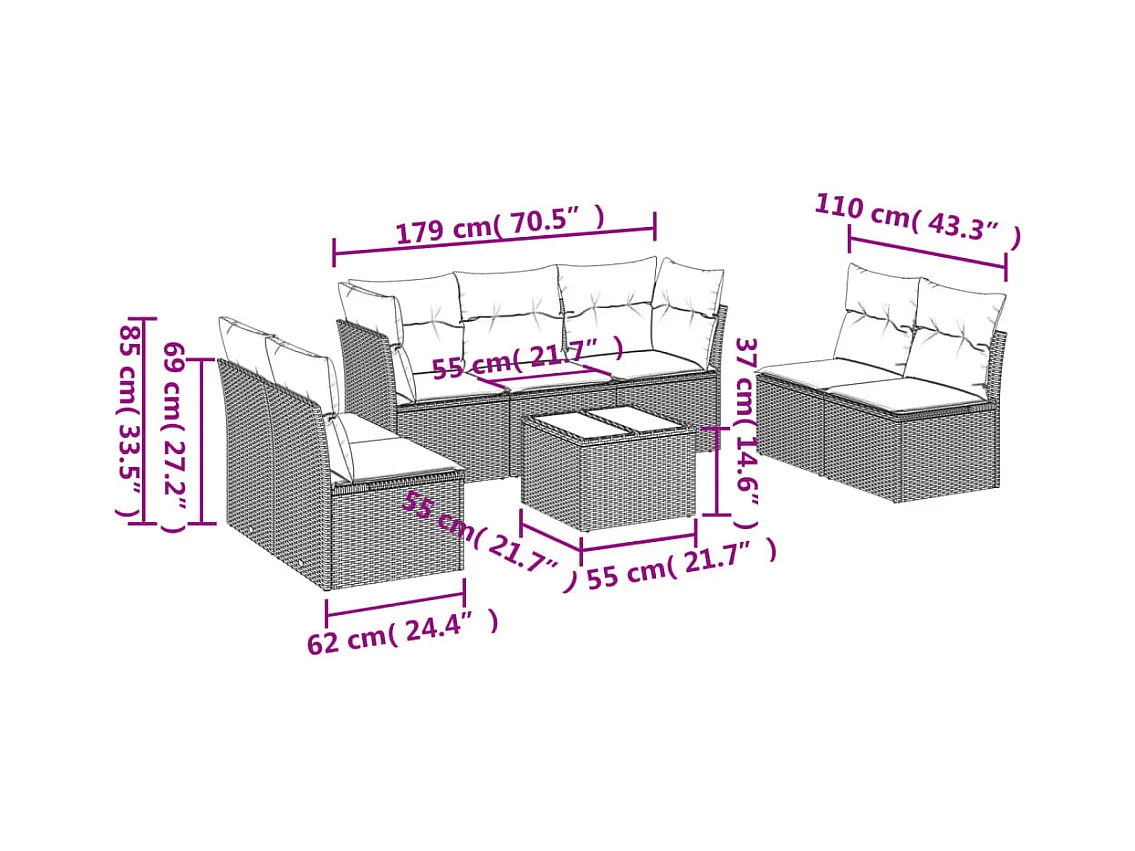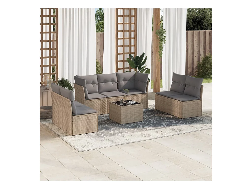 8 pcs conjunto de sofás p/ jardim com almofadões vime PE bege