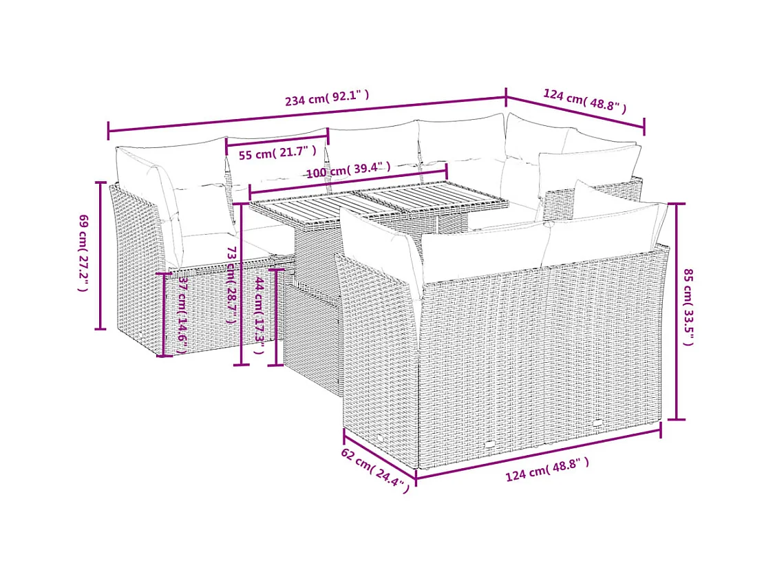 7 peças conjunto de sofás para jardim com almofadões vime PE bege