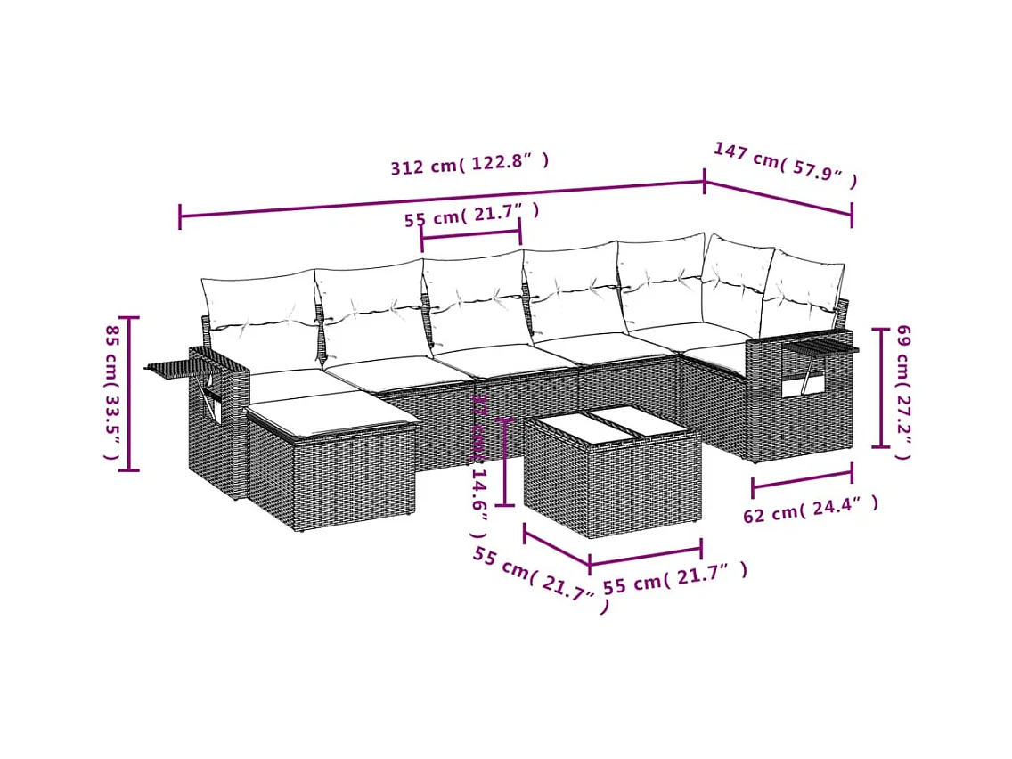 7 pcs conjunto de sofás p/ jardim c/ almofadões vime PE preto