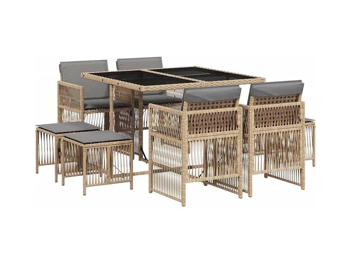 9 pcs conj. jantar jardim c/ almofadões vime PE bege misturado
