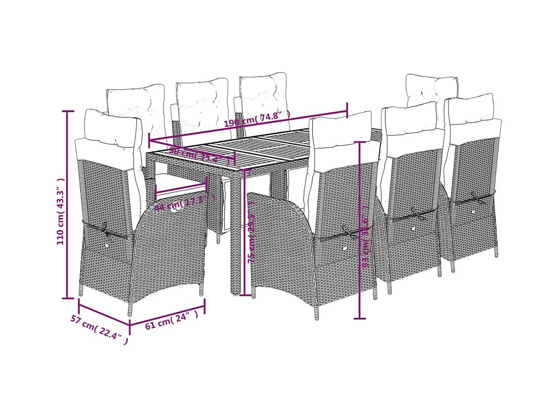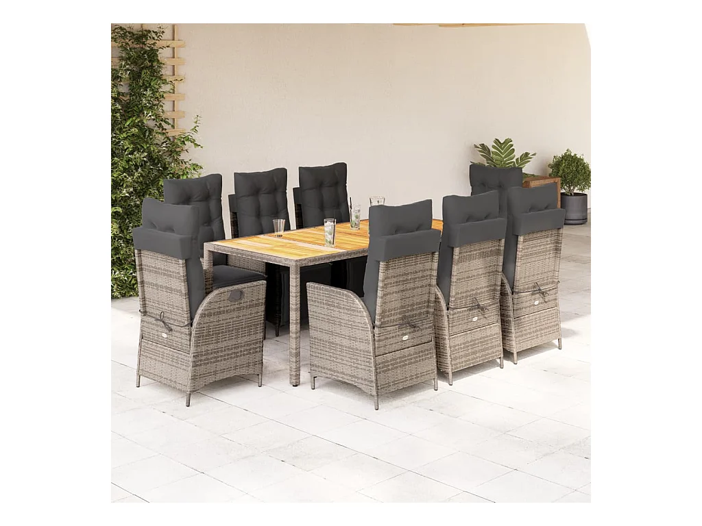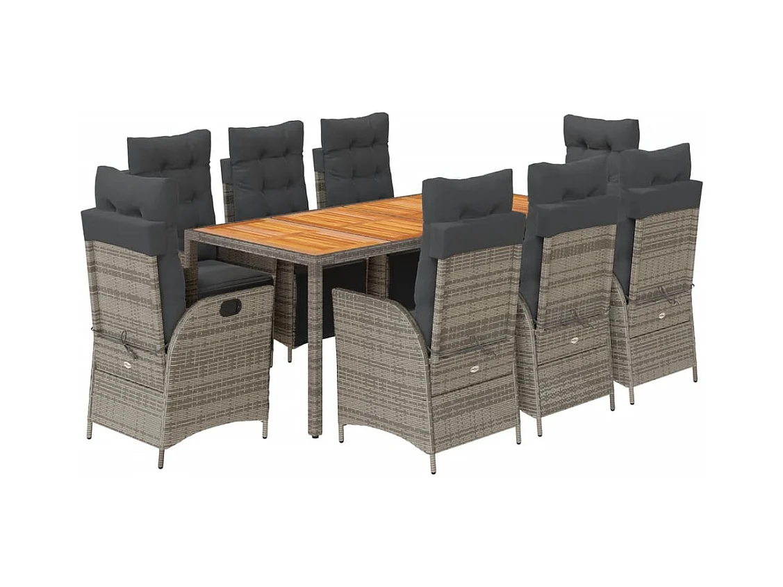 9 pcs conjunto de jantar p/ jardim c/ almofadões vime PE cinza