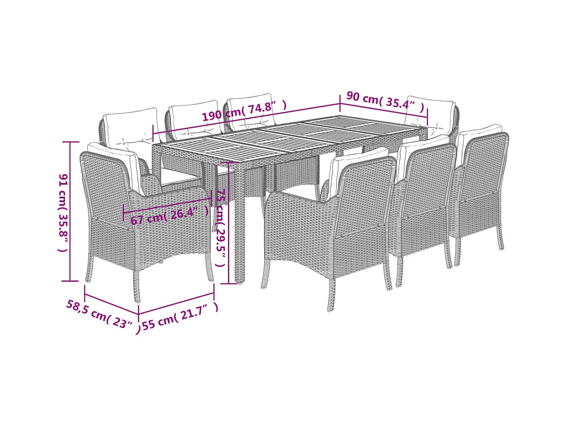 9 pcs conjunto jantar jardim c/ almofadões vime PE/acácia bege