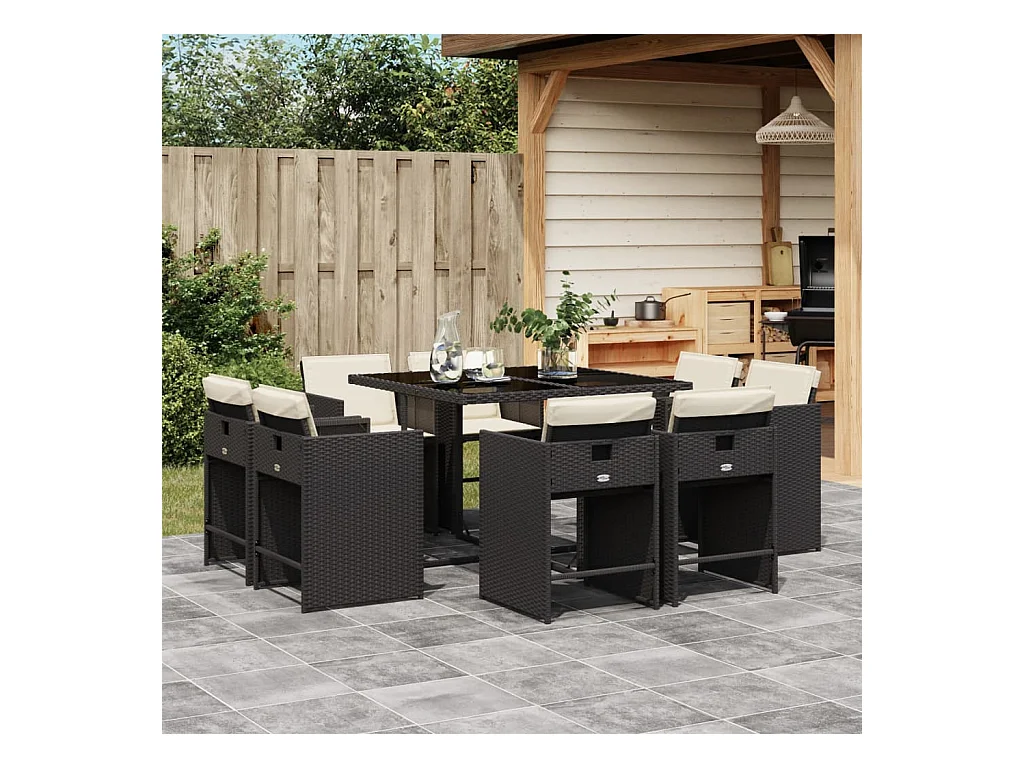 9 pcs conjunto de jantar p/ jardim c/ almofadões vime PE preto