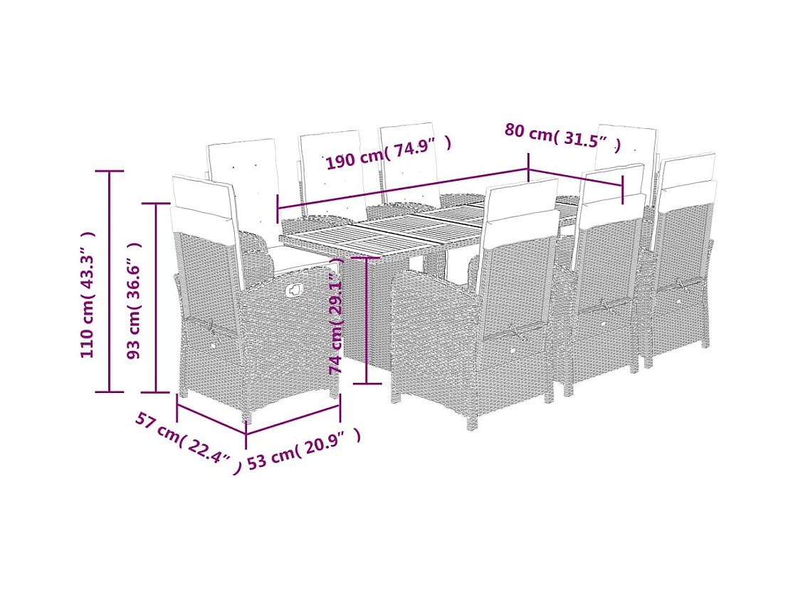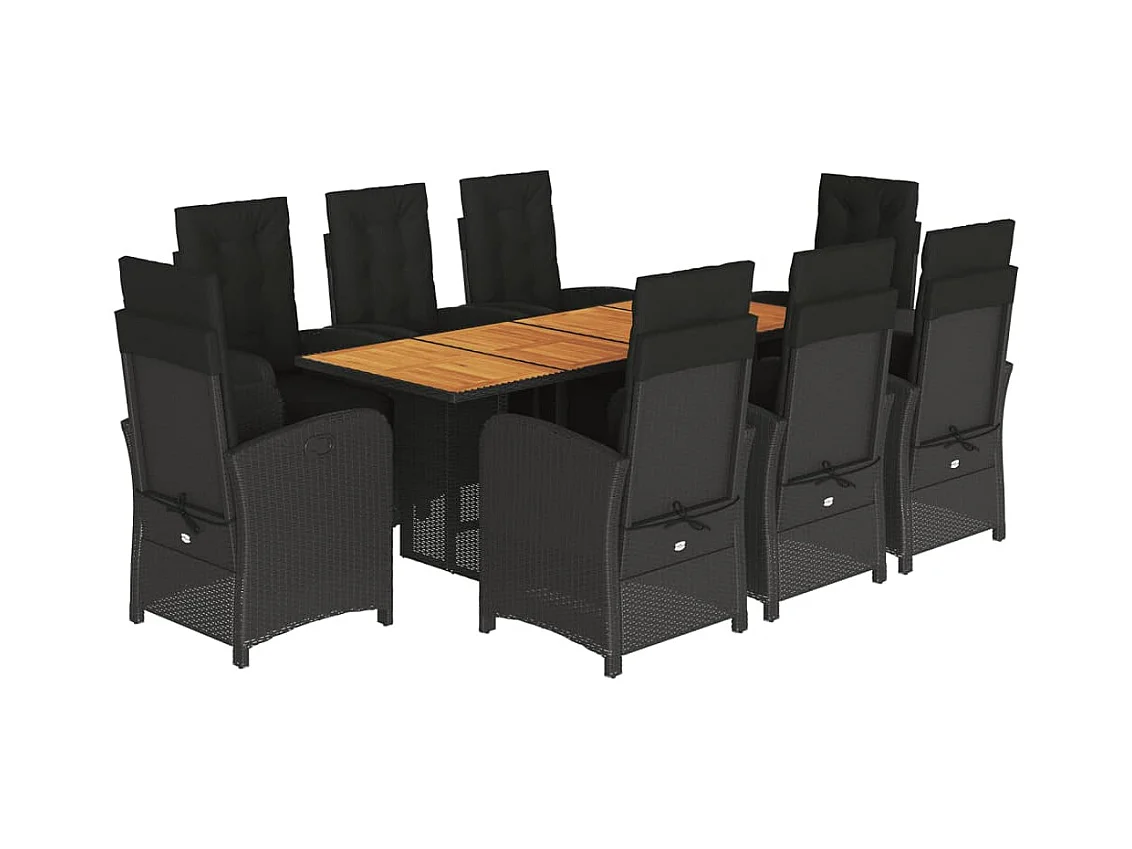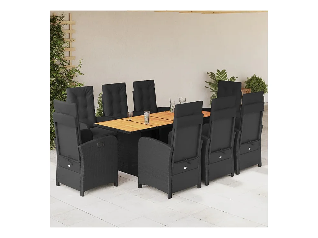 9 pcs conjunto de jantar p/ jardim c/ almofadões vime PE preto