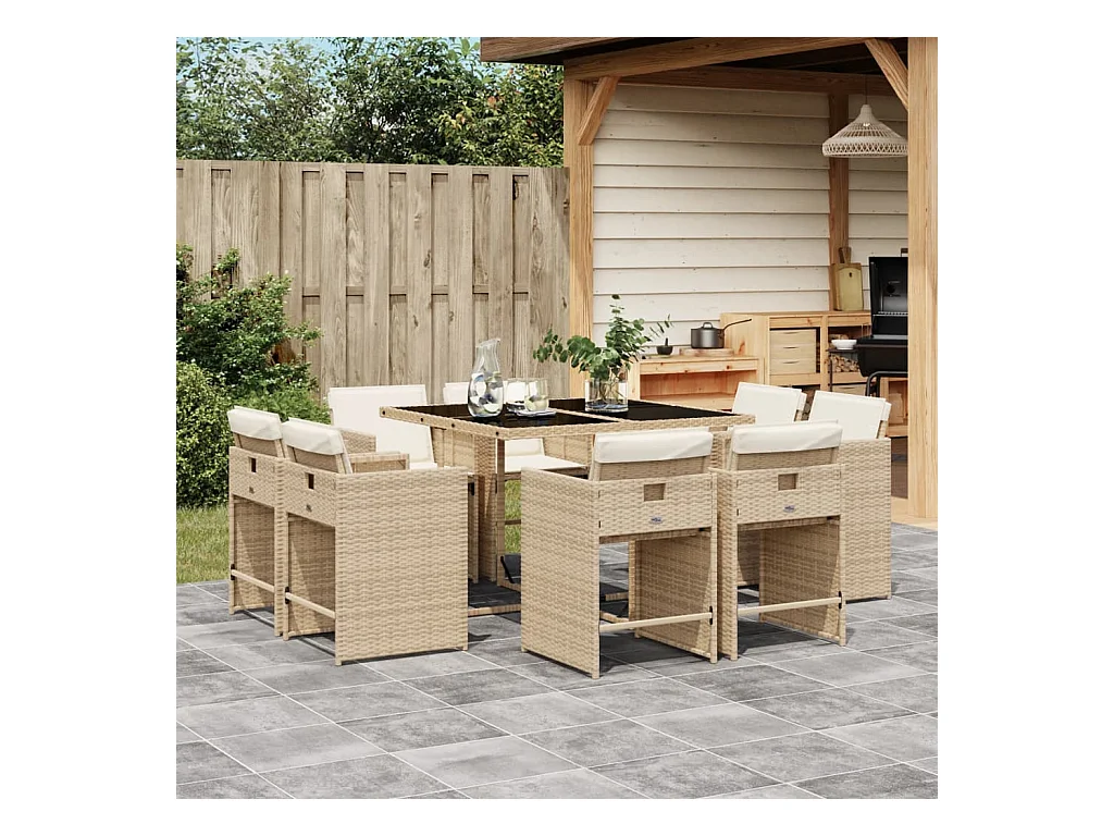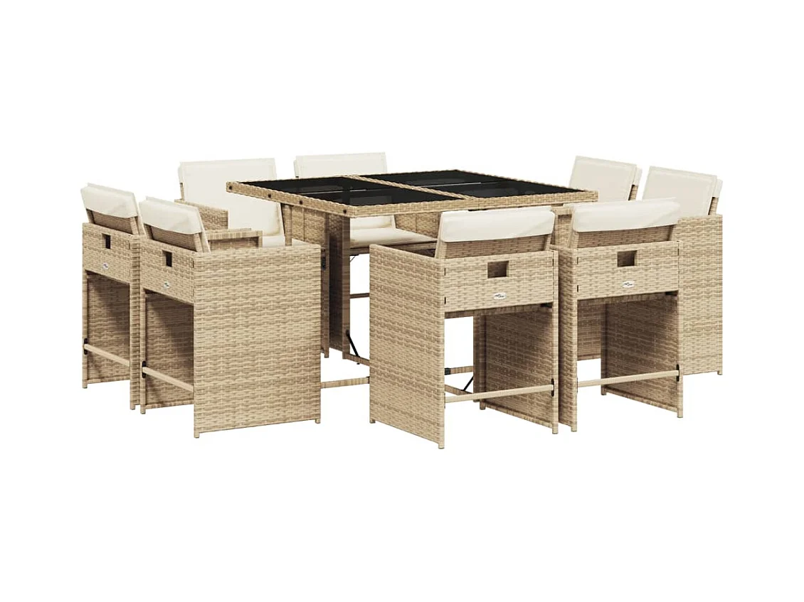 9 pcs conjunto de jantar p/ jardim com almofadões vime PE bege