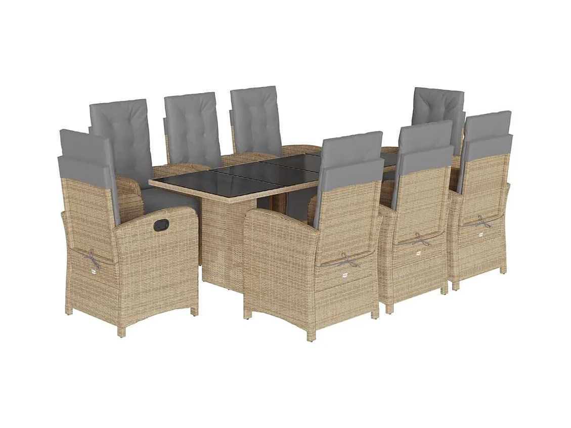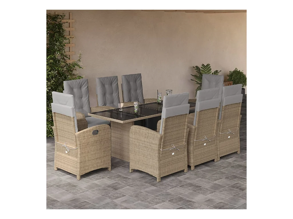 9 pcs conjunto de jantar p/ jardim com almofadões vime PE bege