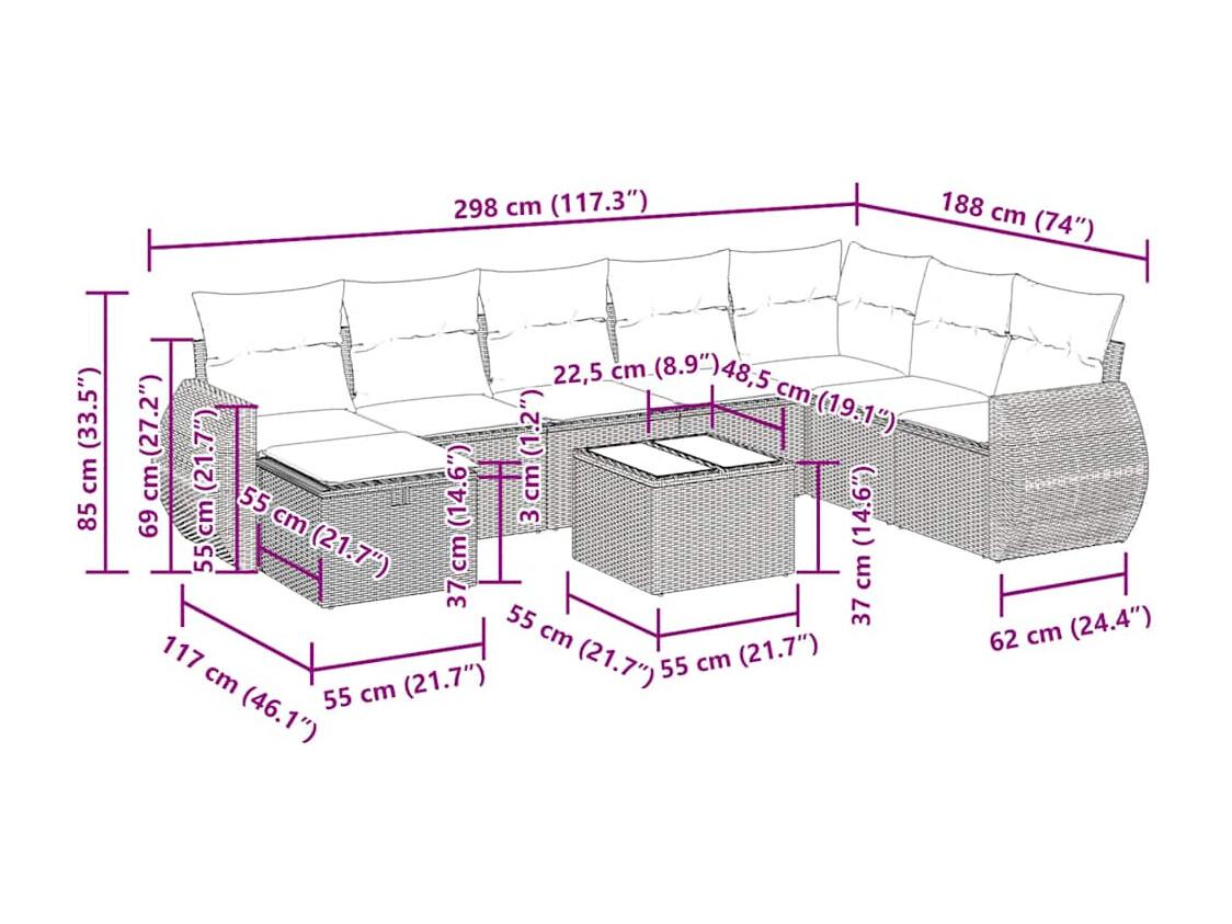 9 pcs conjunto de sofás p/ jardim com almofadões vime PE bege