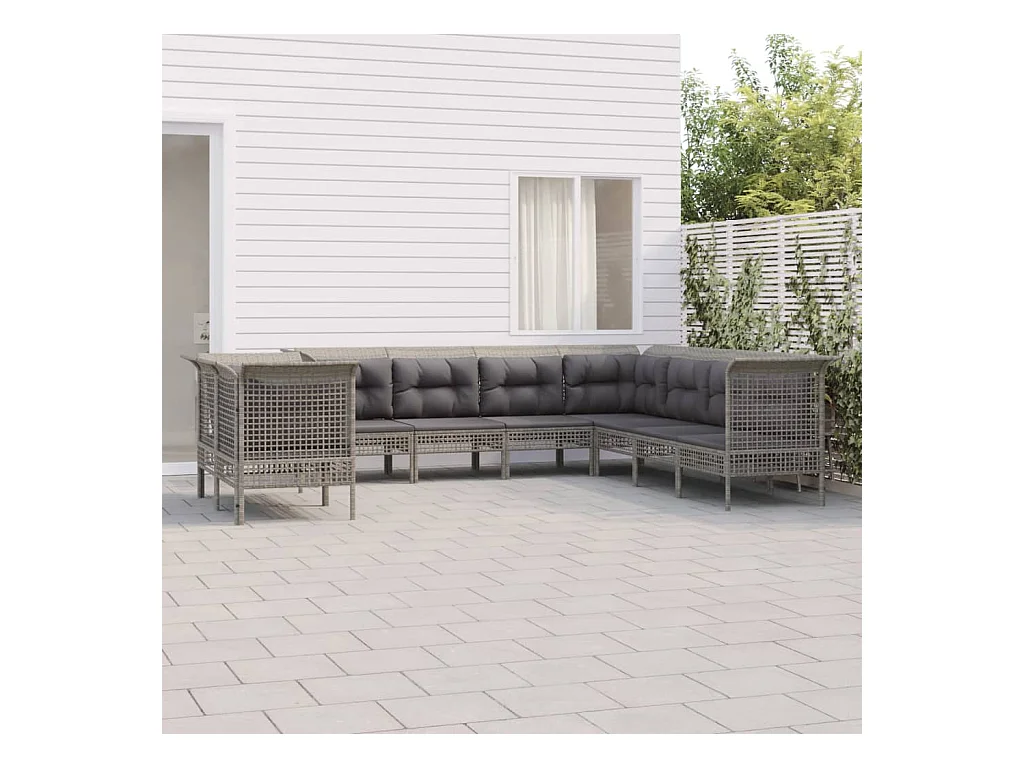 10 pcs conjunto lounge de jardim c/ almofadões vime PE cinzento