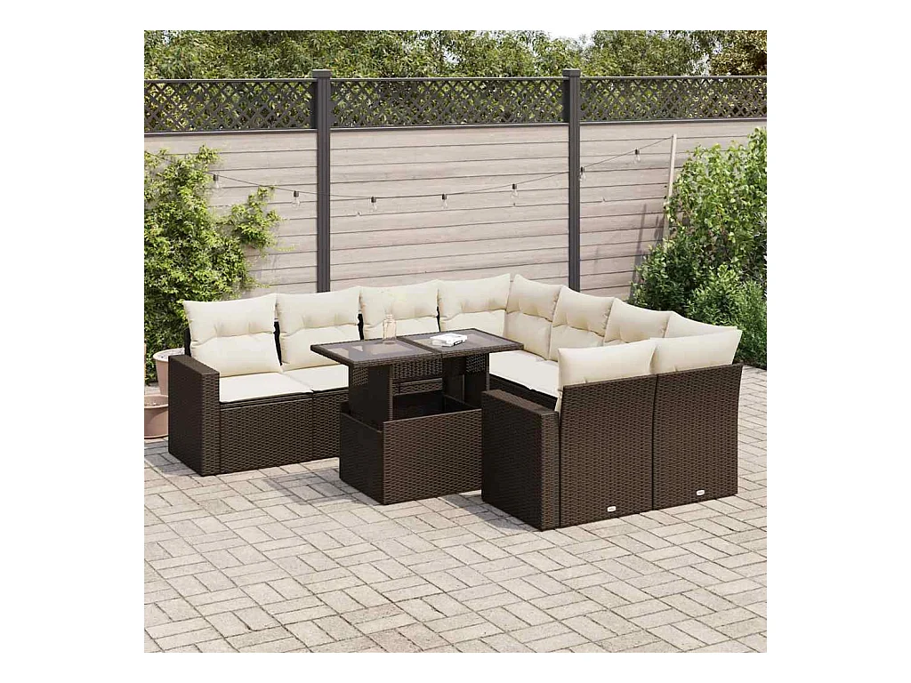 9 pcs conjunto sofás p/ jardim c/ almofadões vime PE castanho