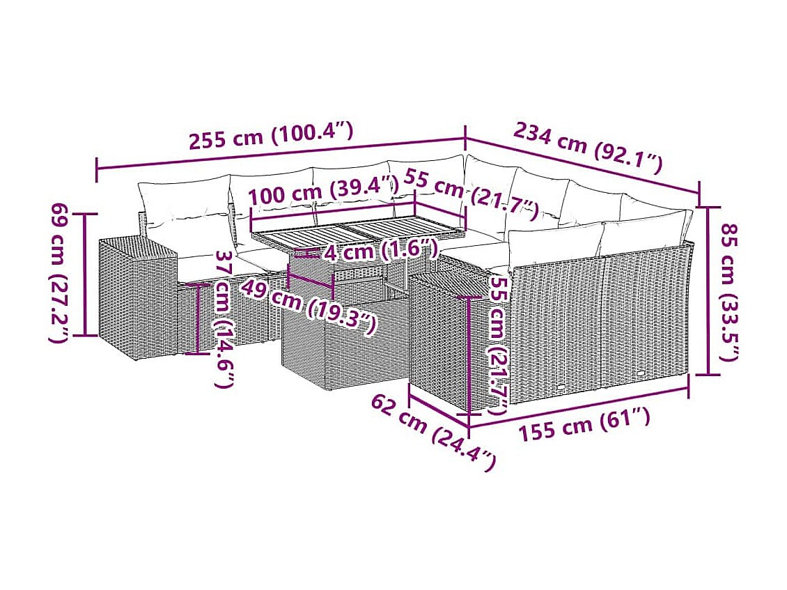 9 pcs conjunto sofás p/ jardim com almofadões vime PE cinzento