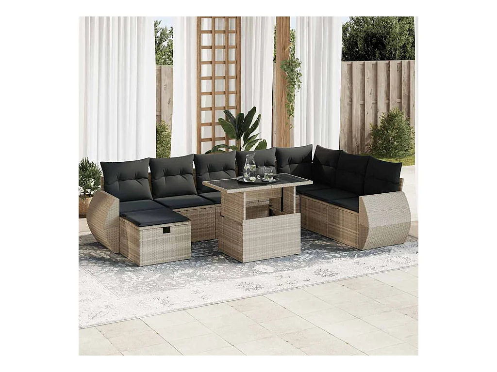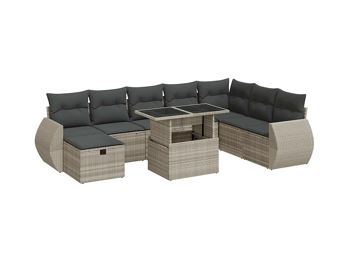 9 peças conj. sofás jardim com almofadões vime PE cinzento-claro