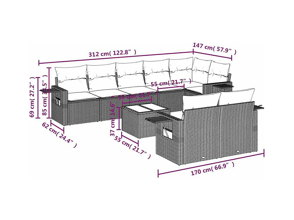 9 peças conj. sofás jardim com almofadões vime PE cinzento-claro