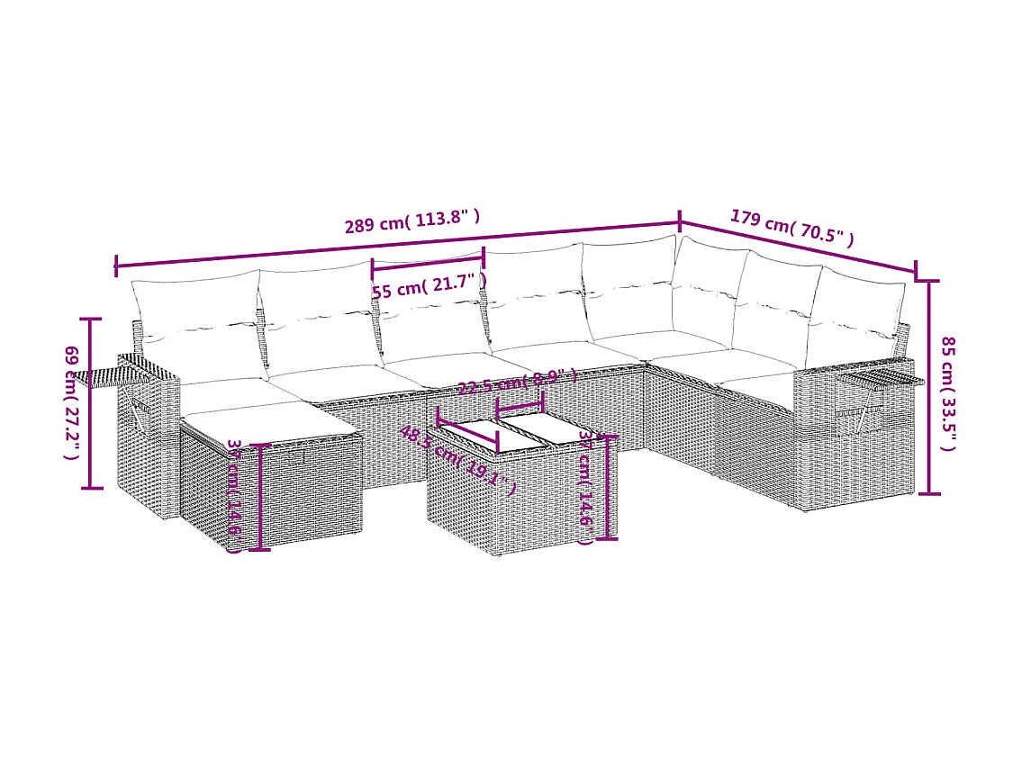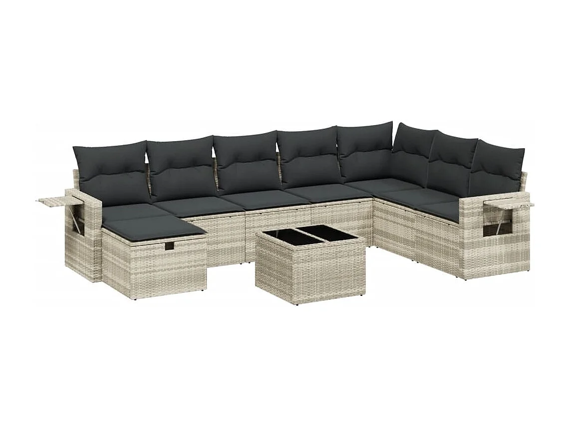 9 peças conj. sofás jardim com almofadões vime PE cinzento-claro