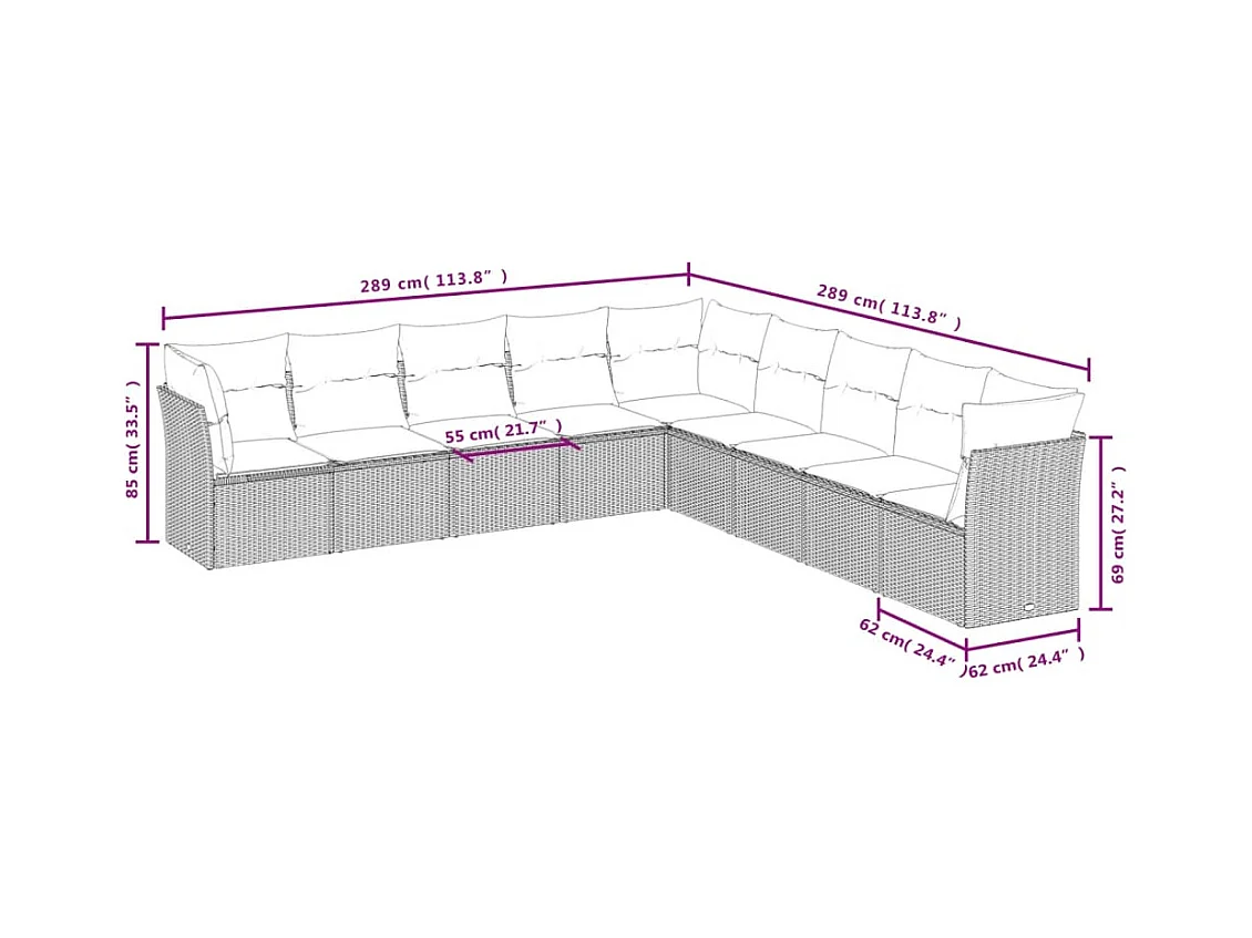 9 peças conj. sofás jardim com almofadões vime PE cinzento-claro