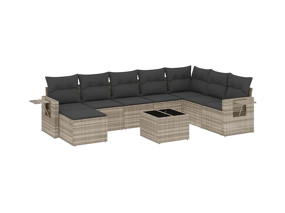 9 peças conj. sofás jardim com almofadões vime PE cinzento-claro
