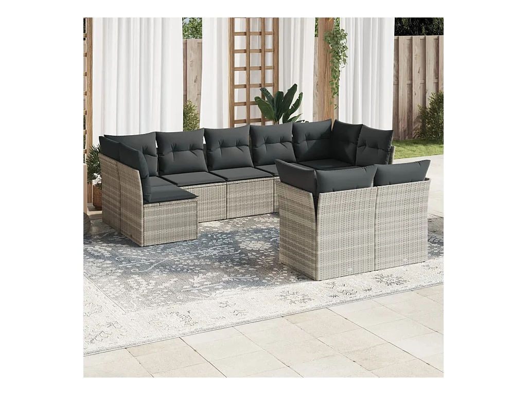 10 peças conj. sofás jardim com almofadões vime PE cinzento-claro