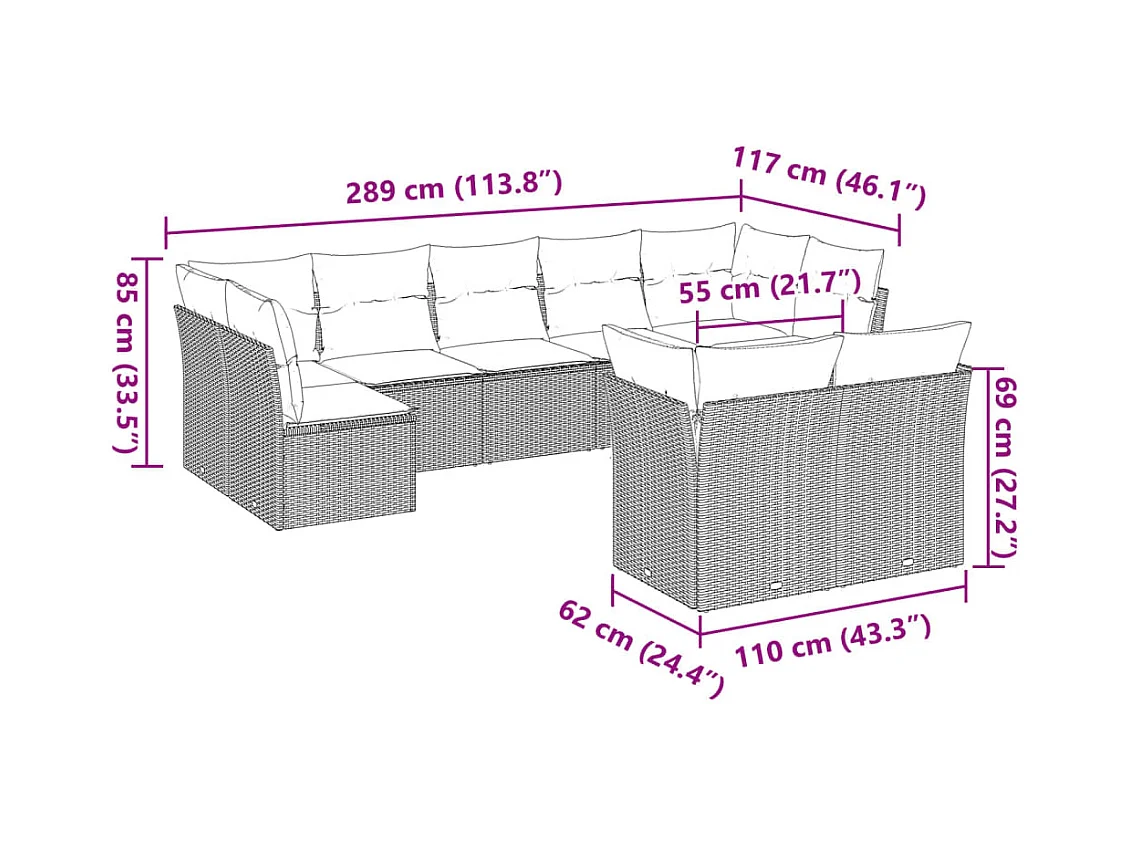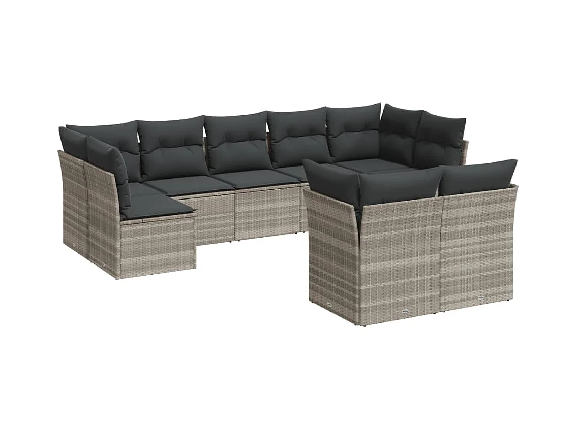 9 peças conj. sofás jardim com almofadões vime PE cinzento-claro