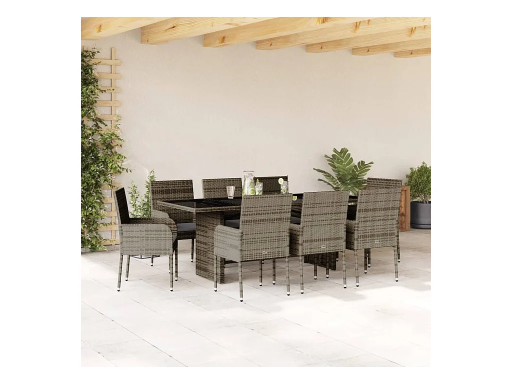 9 peças conjunto jantar jardim com almofadões vime PE/vidro cinza