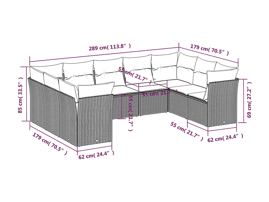 9 peças conjunto de sofás p/ jardim com almofadões vime PE bege