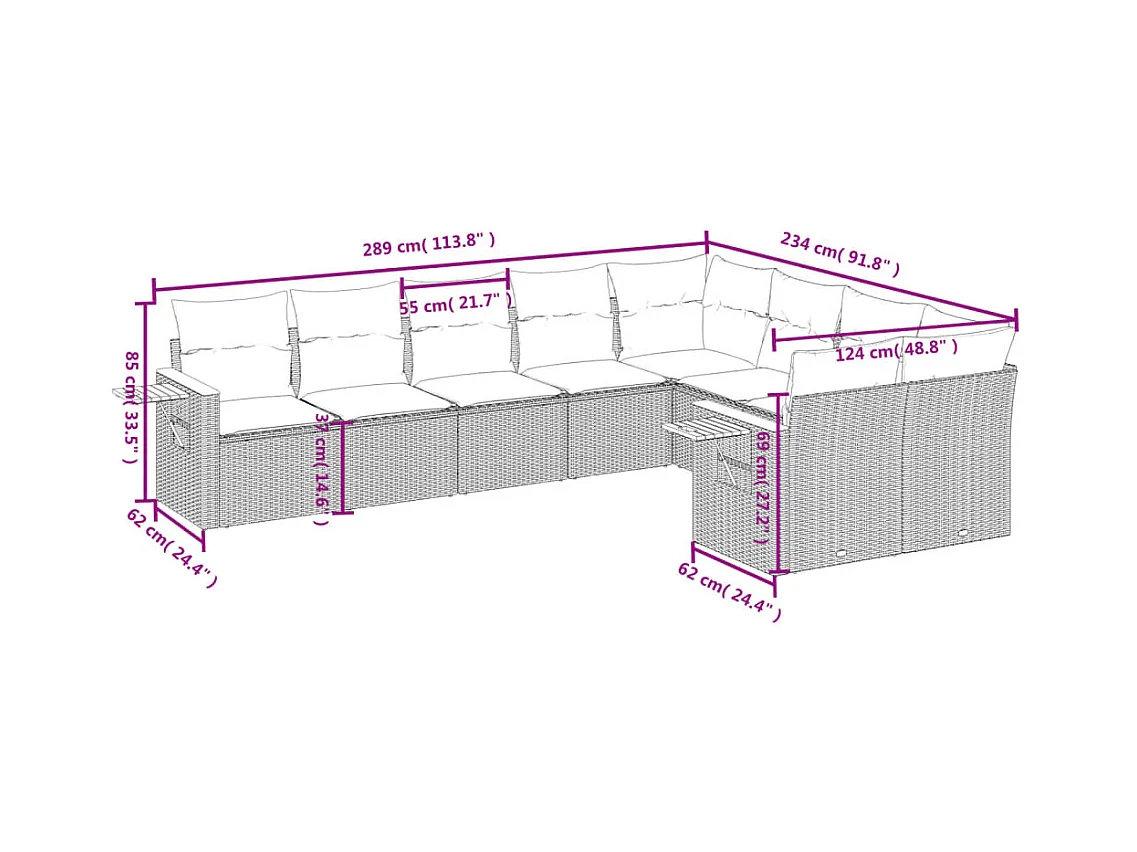 9 pcs conjunto de sofás p/ jardim com almofadões vime PE bege