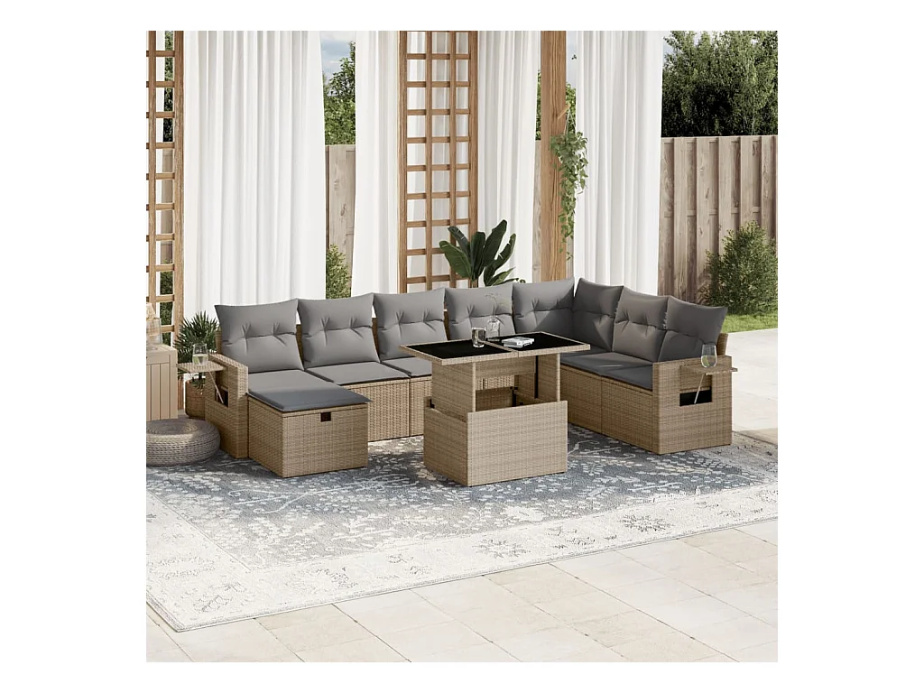9 peças conjunto de sofás para jardim com almofadões vime PE bege