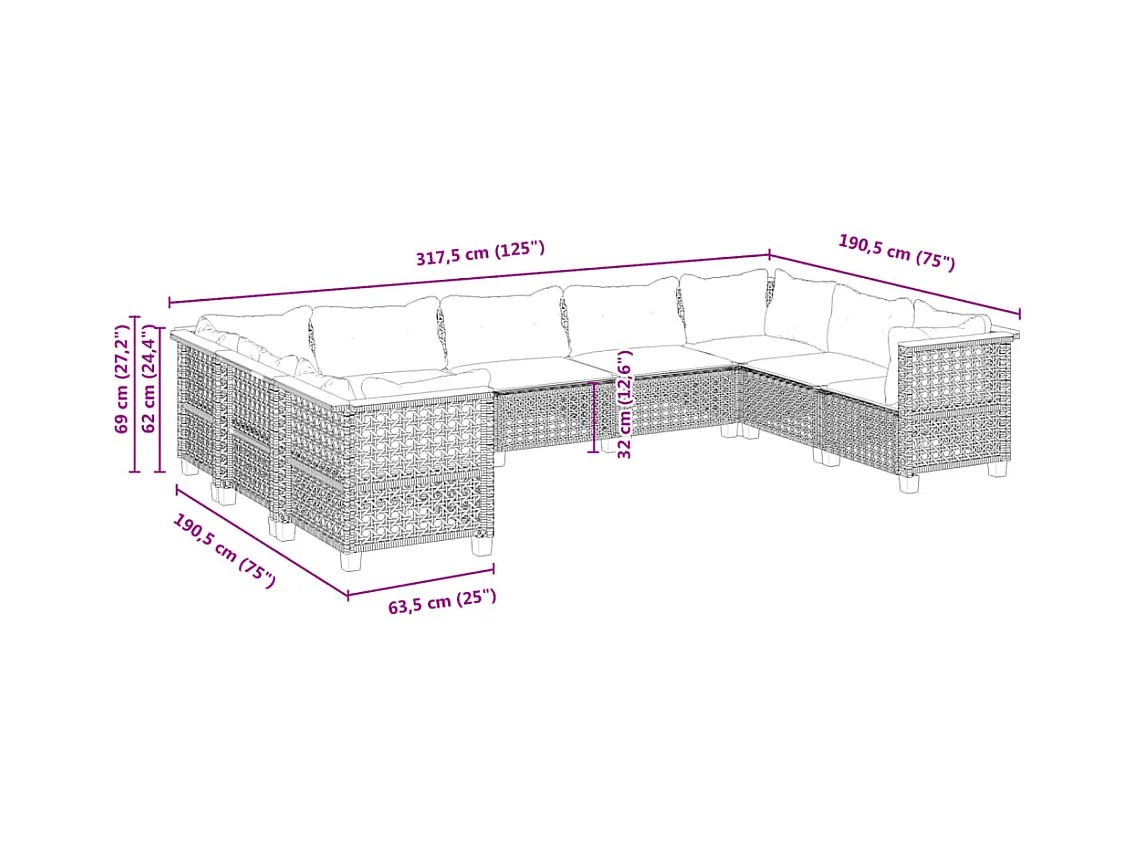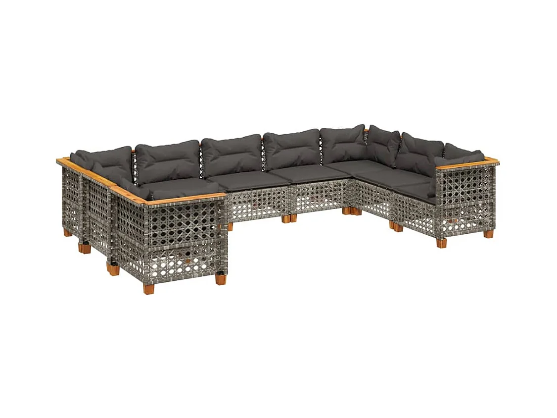 9 peças conjunto sofás para jardim com almofadões vime PE cinzento