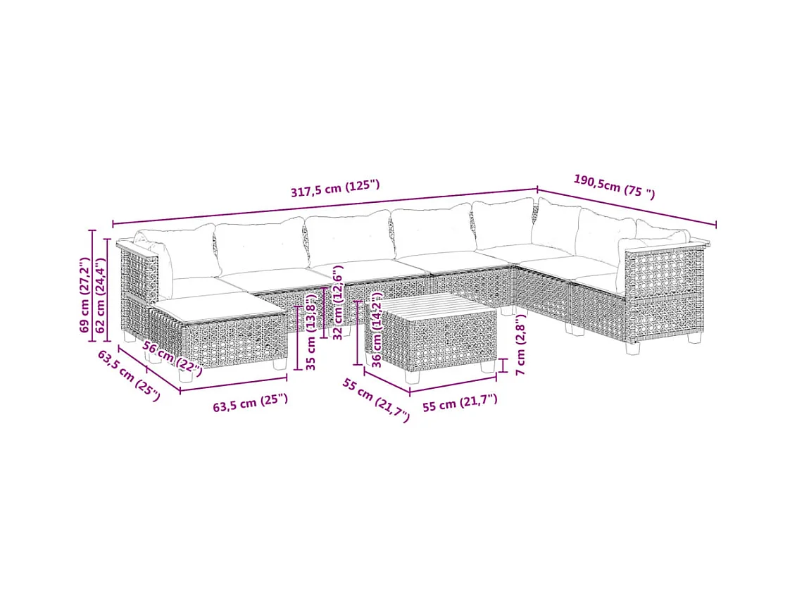 9 peças conjunto sofás para jardim com almofadões vime PE cinzento