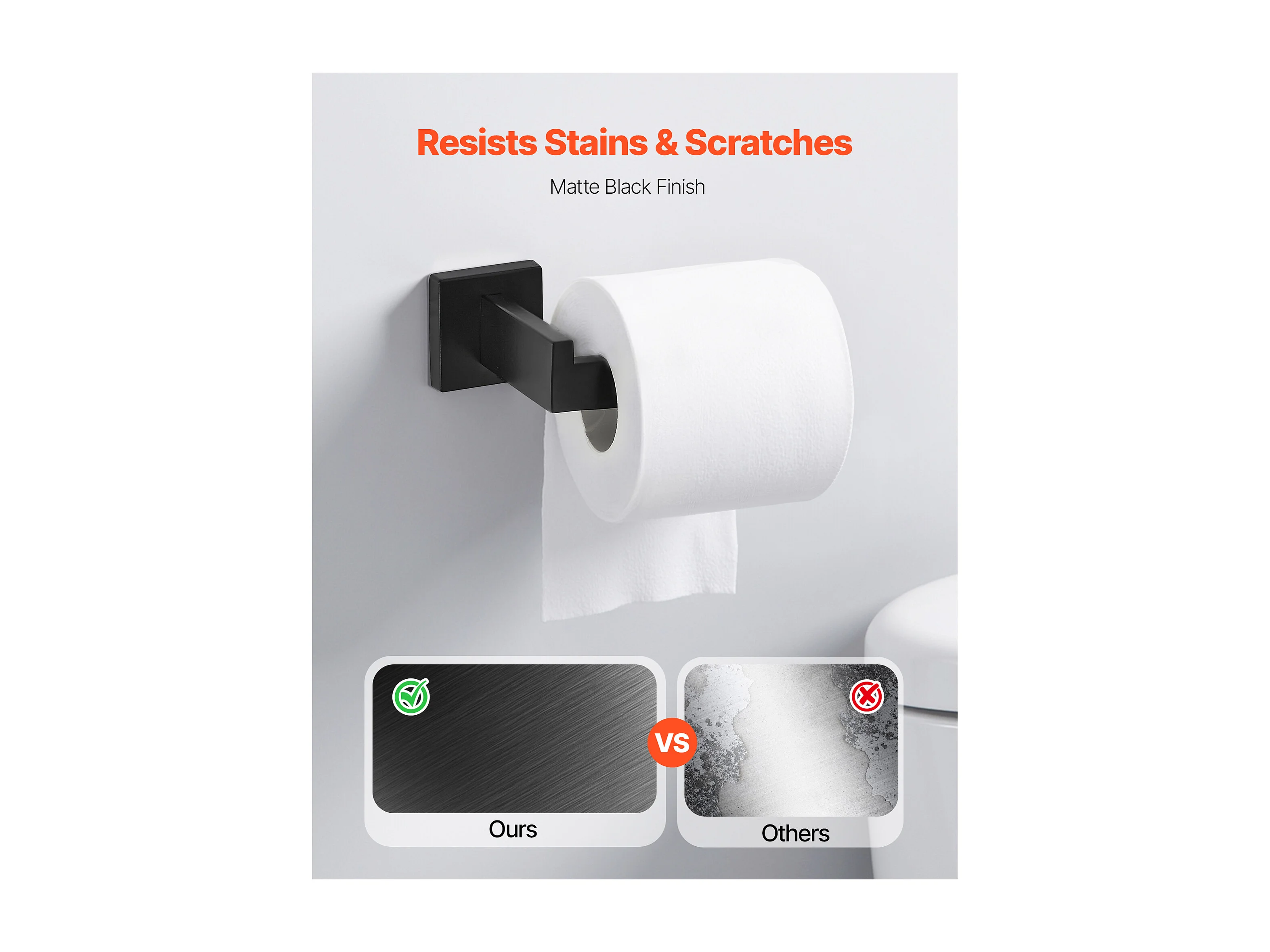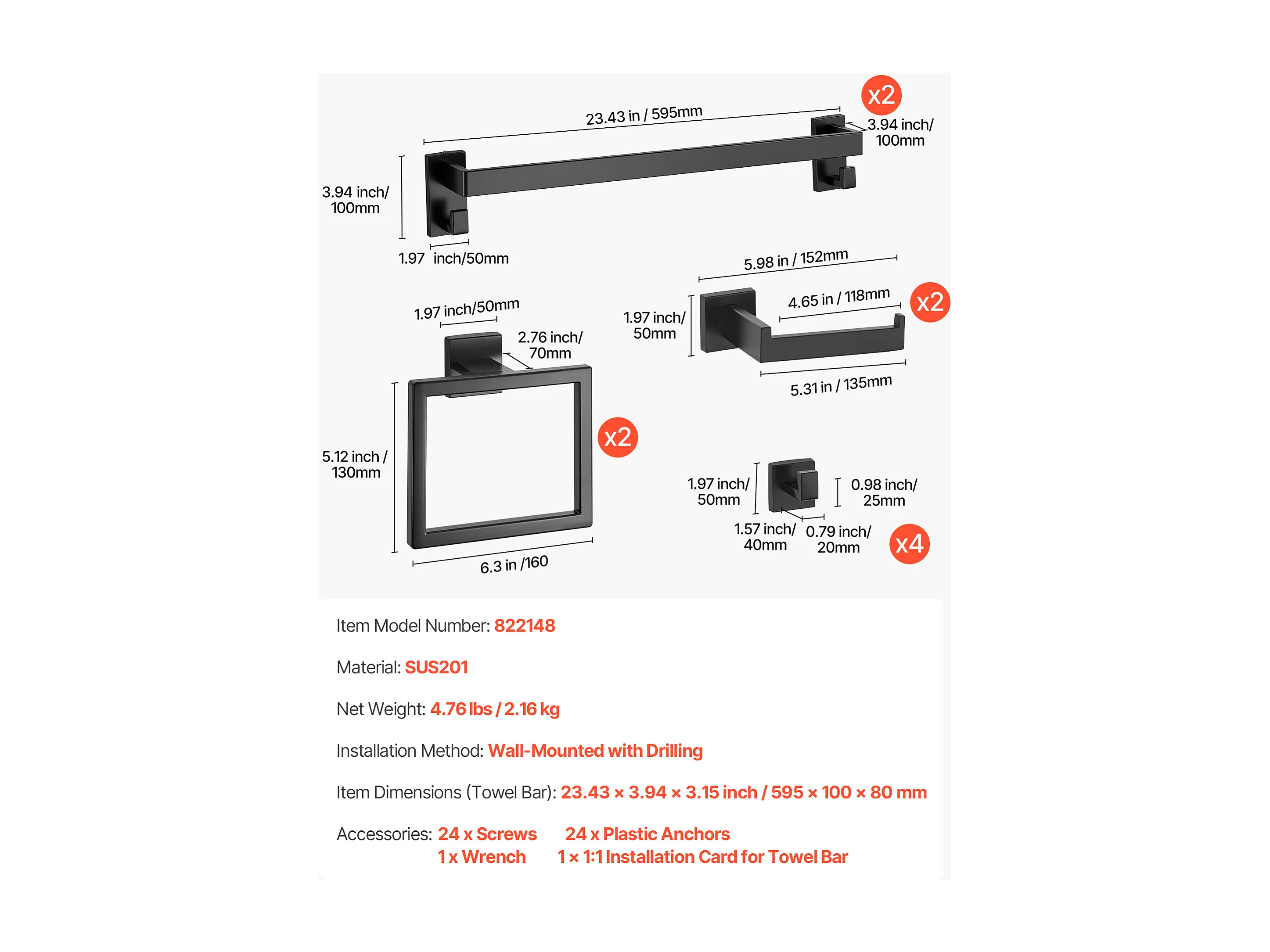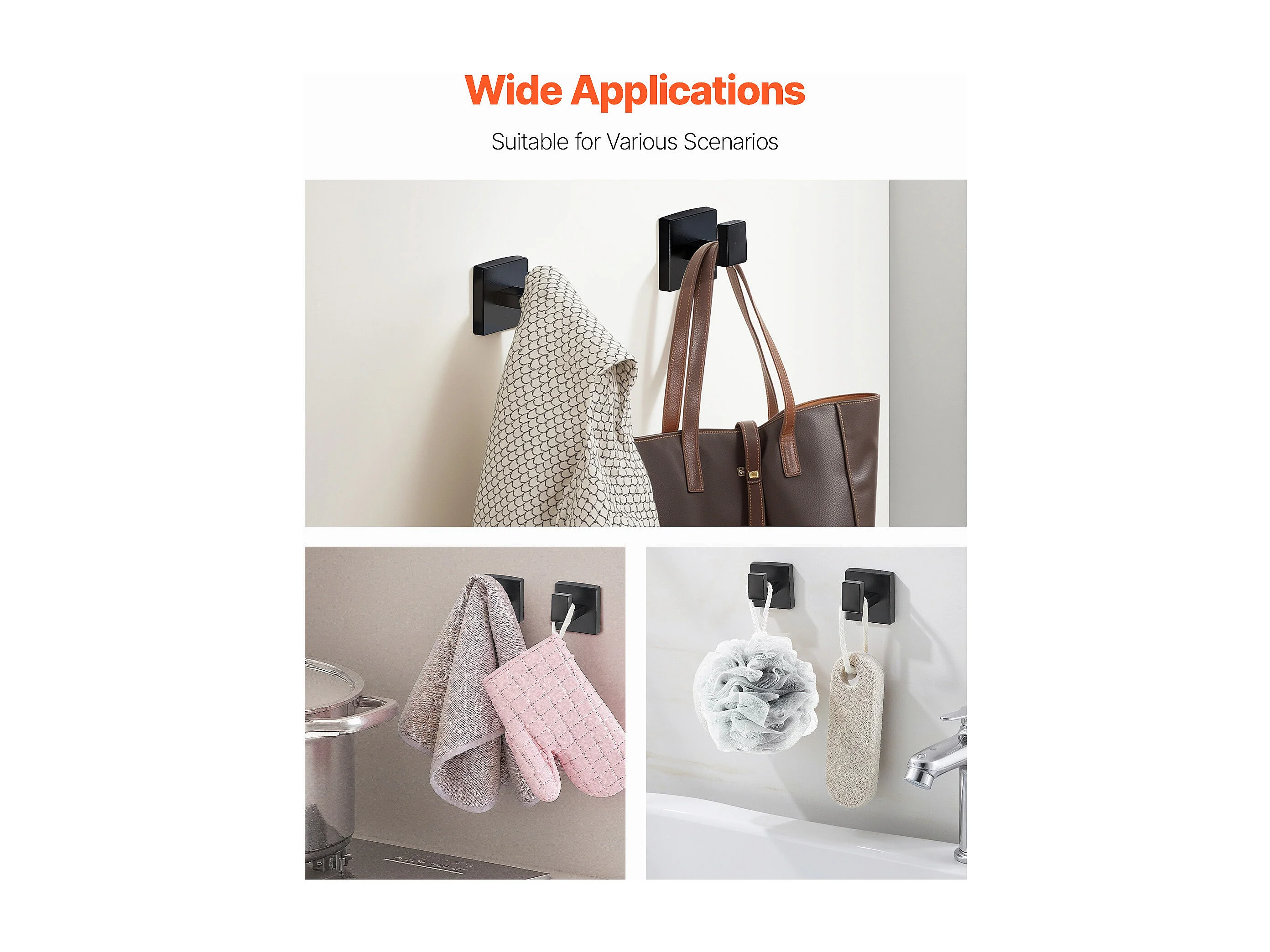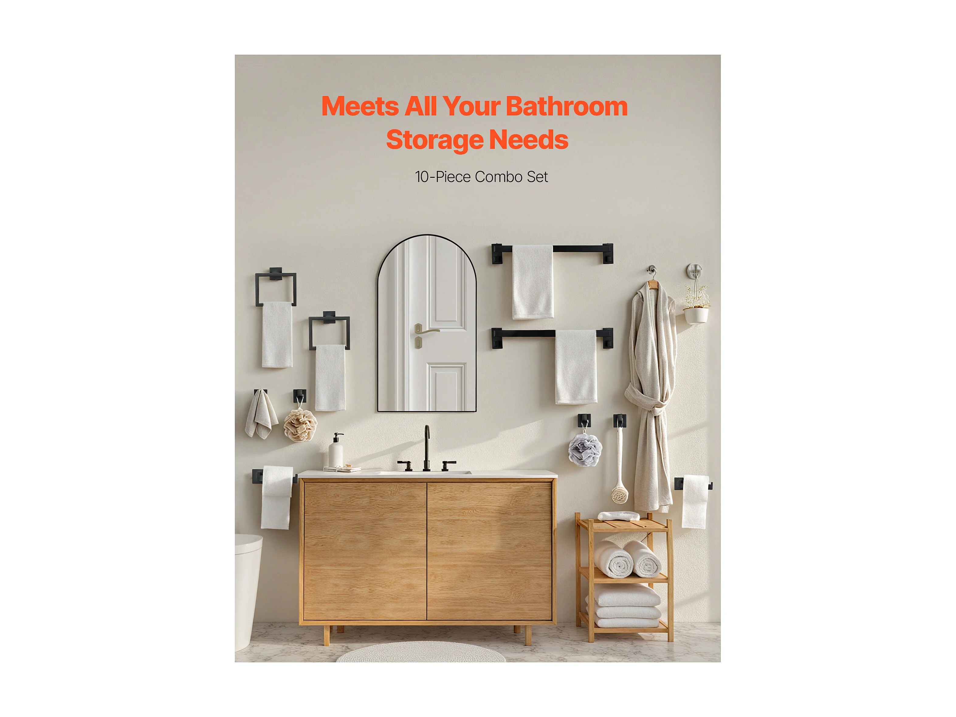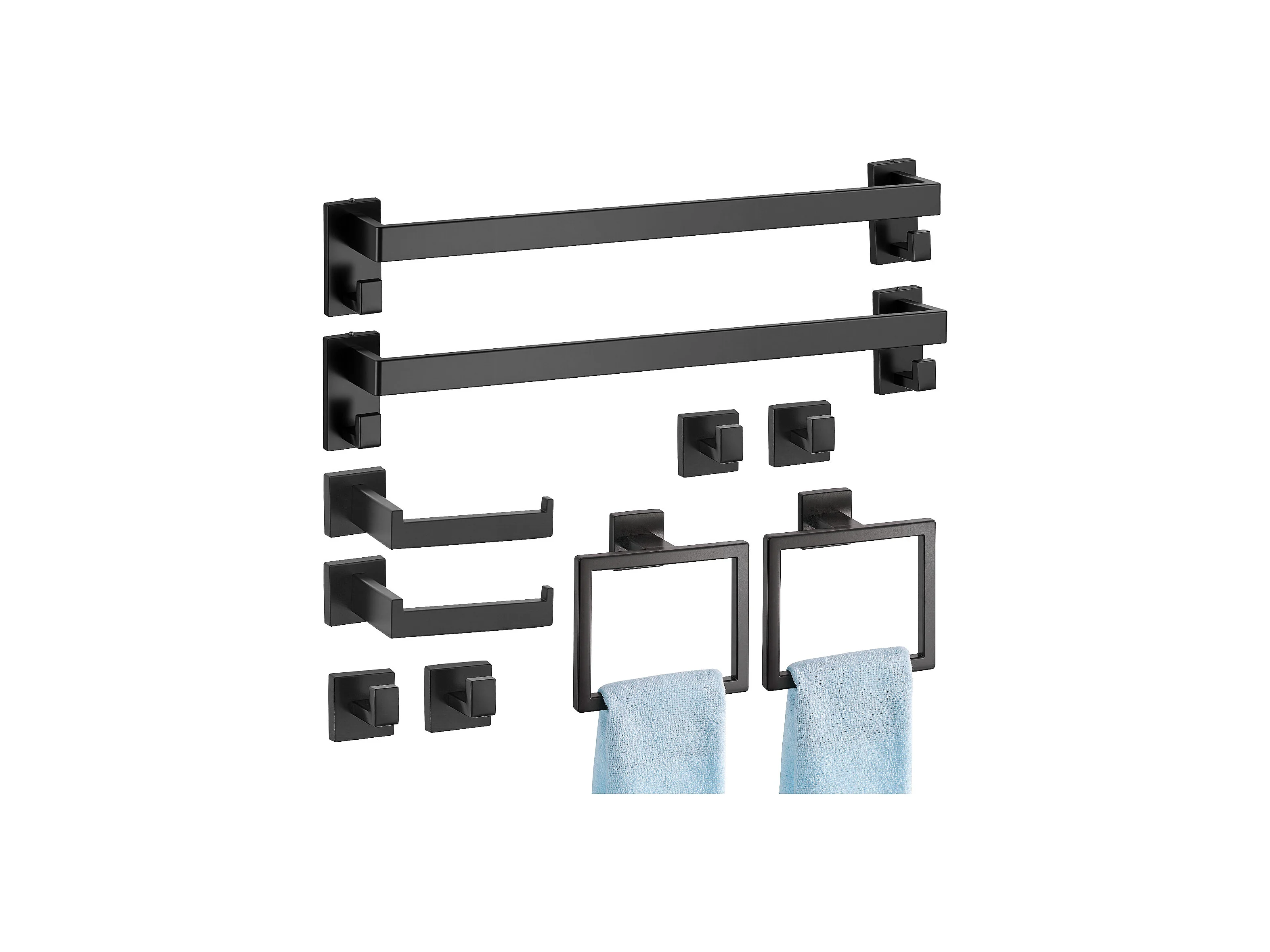 Acessórios de Banheiro SucceBuy 10PCs, 2 Toalheiros de Aço Inoxidável 59,5 cm com 2 Suportes de Toalha Quadrados, 4 Ganchos para Roupão, Preto Fosco