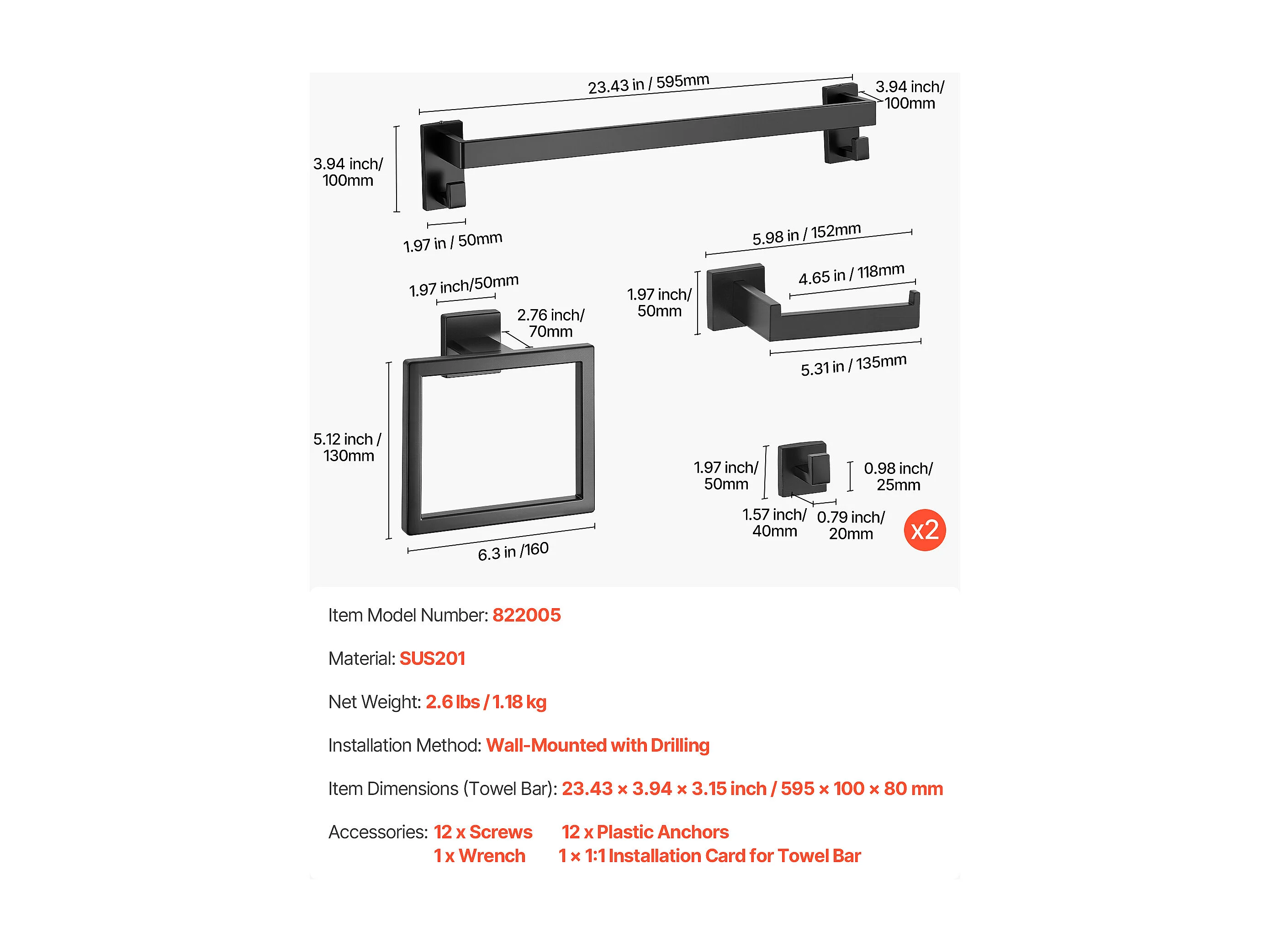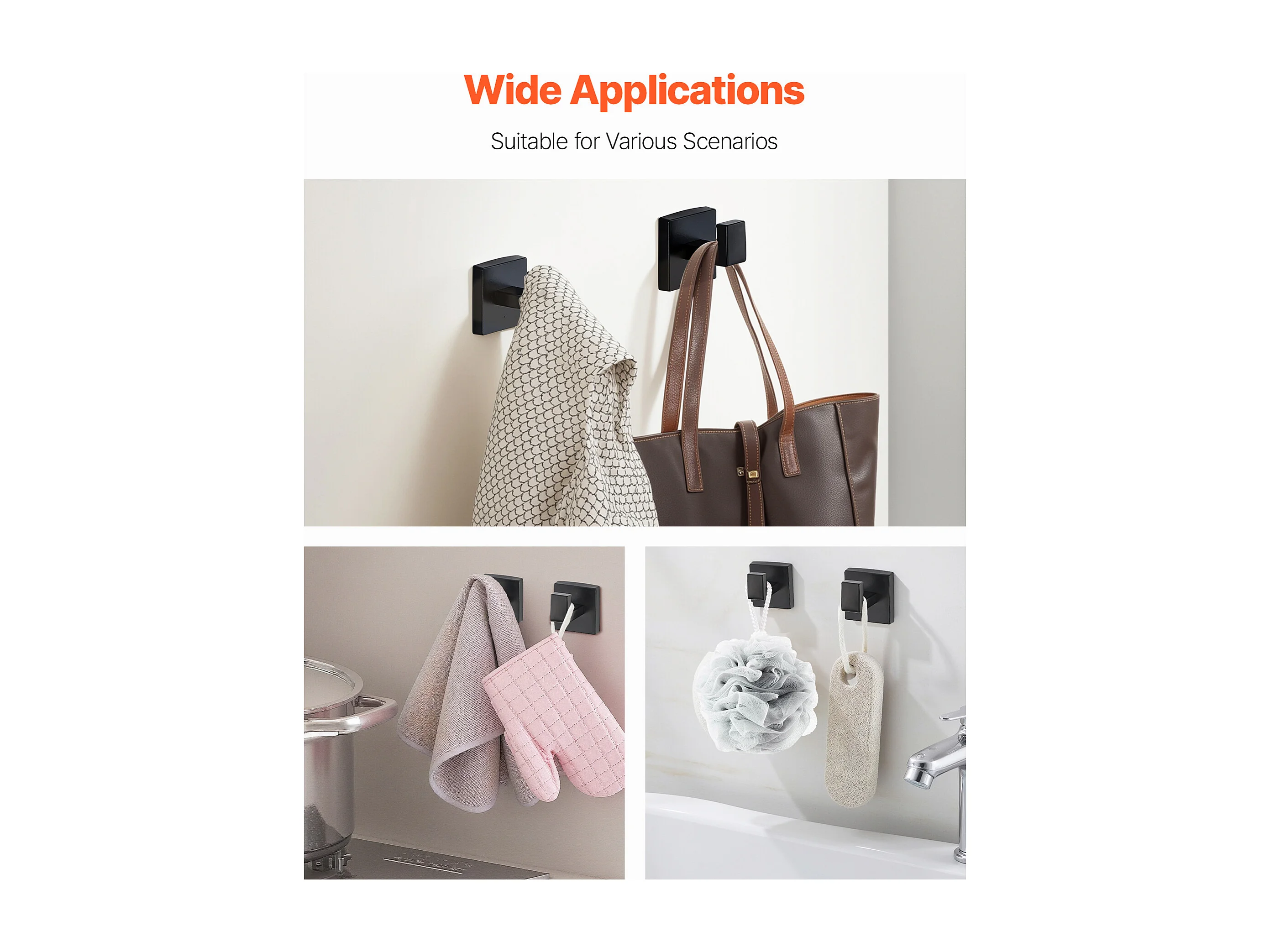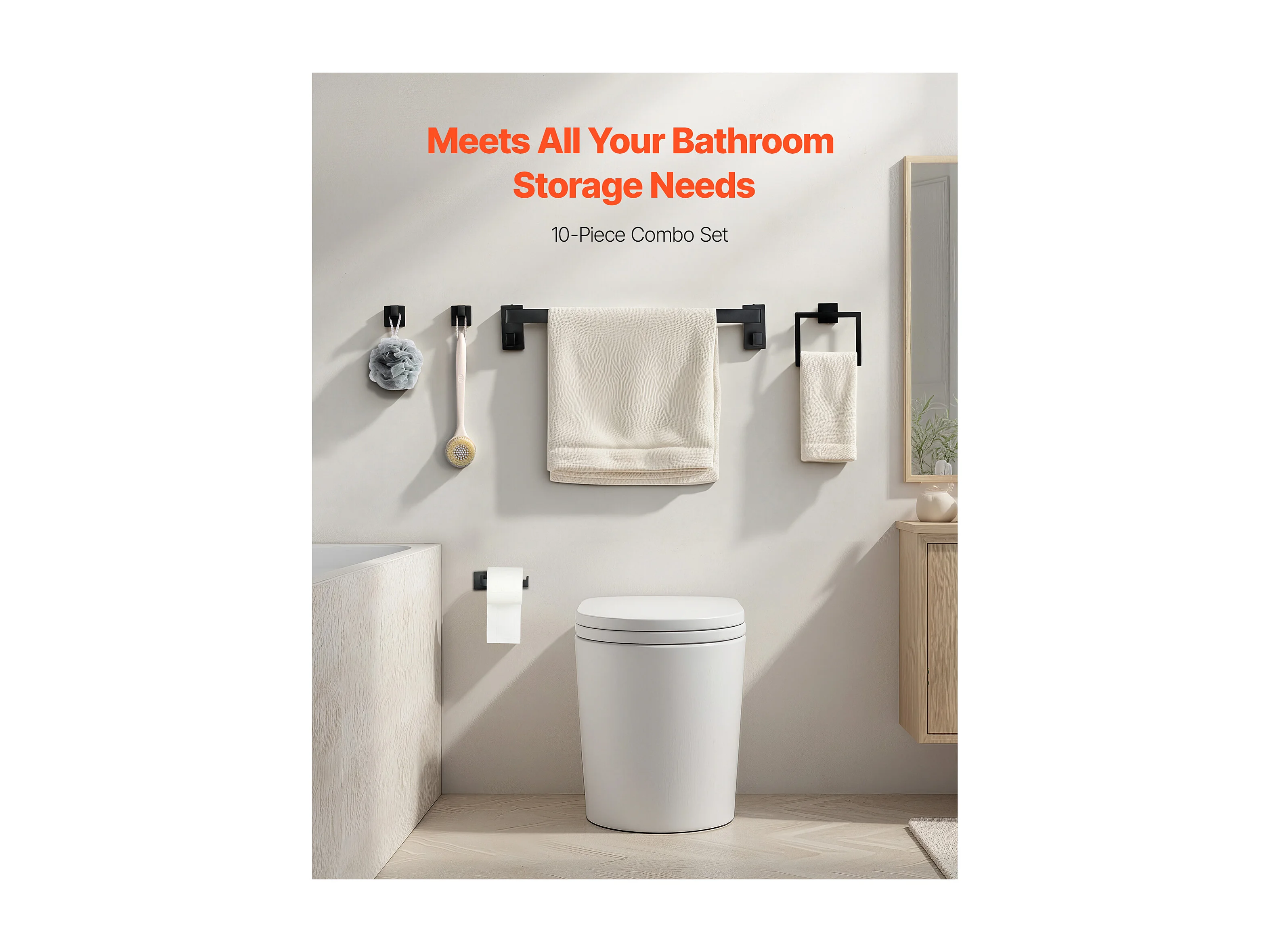 Acessórios de Banheiro SucceBuy 10PCs, 2 Toalheiros de Aço Inoxidável 59,5 cm com 2 Suportes de Toalha Quadrados, 4 Ganchos para Roupão, Preto Fosco