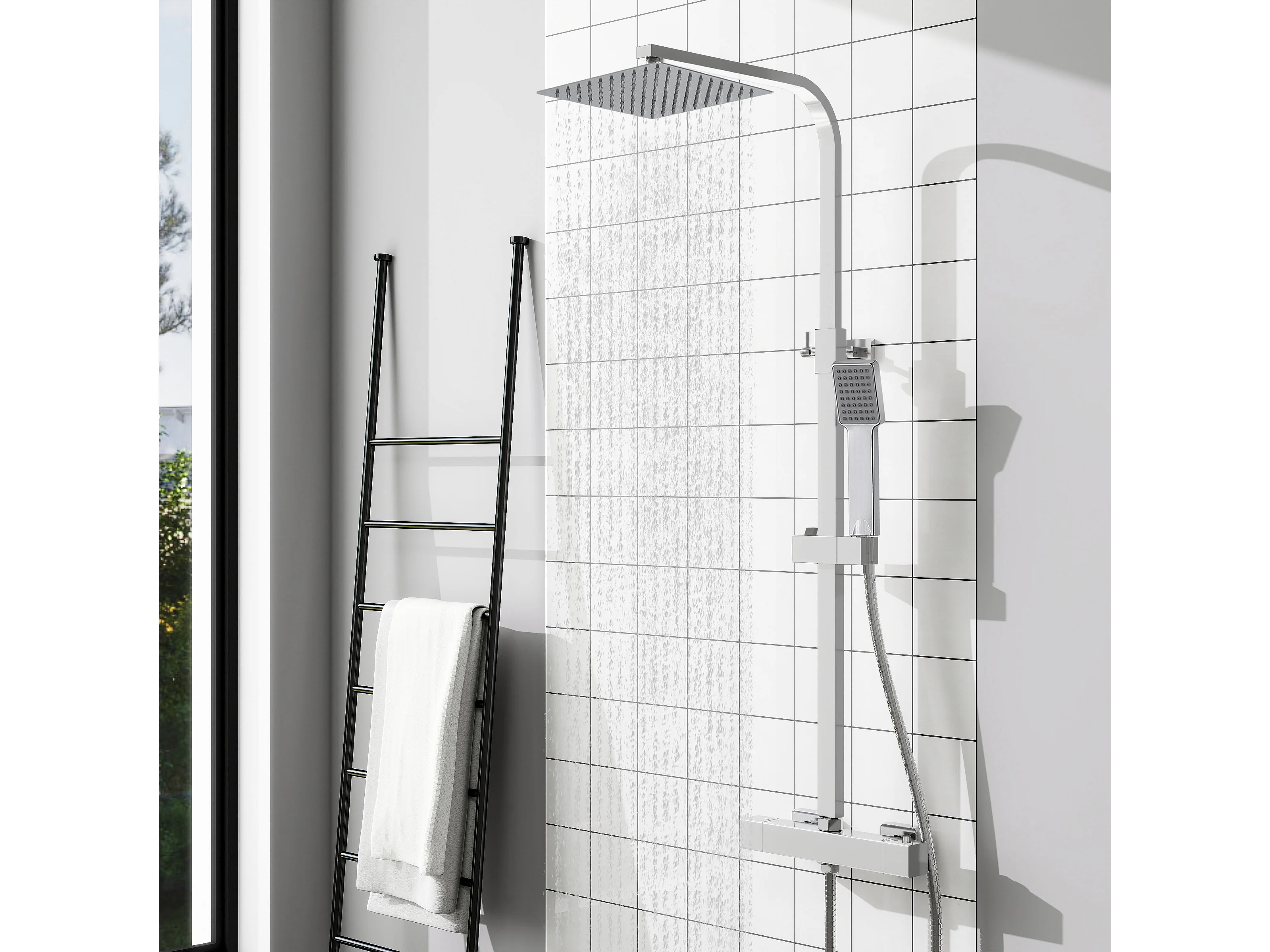 AICA Coluna de chuveiro termostática cromada com cabeça quadrada, aspersor superior e barra ajustável