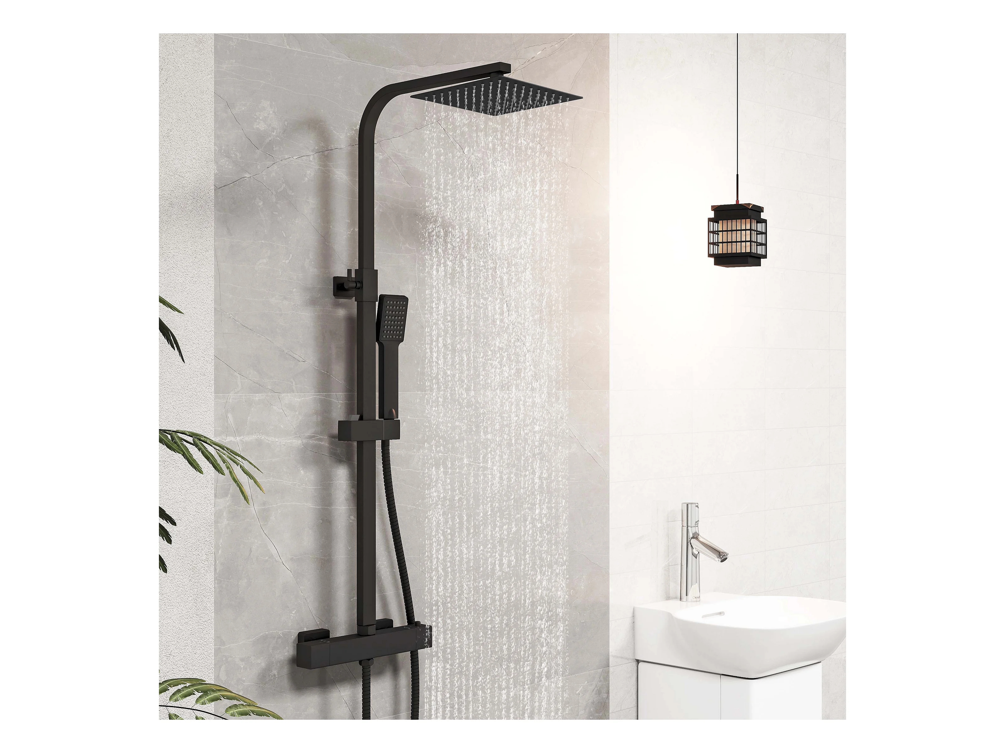 Coluna de Chuveiro Termostática AICA Preta Mate Ajustável com Chuveiro de Mão e Chuveiro Superior Grande Quadrado