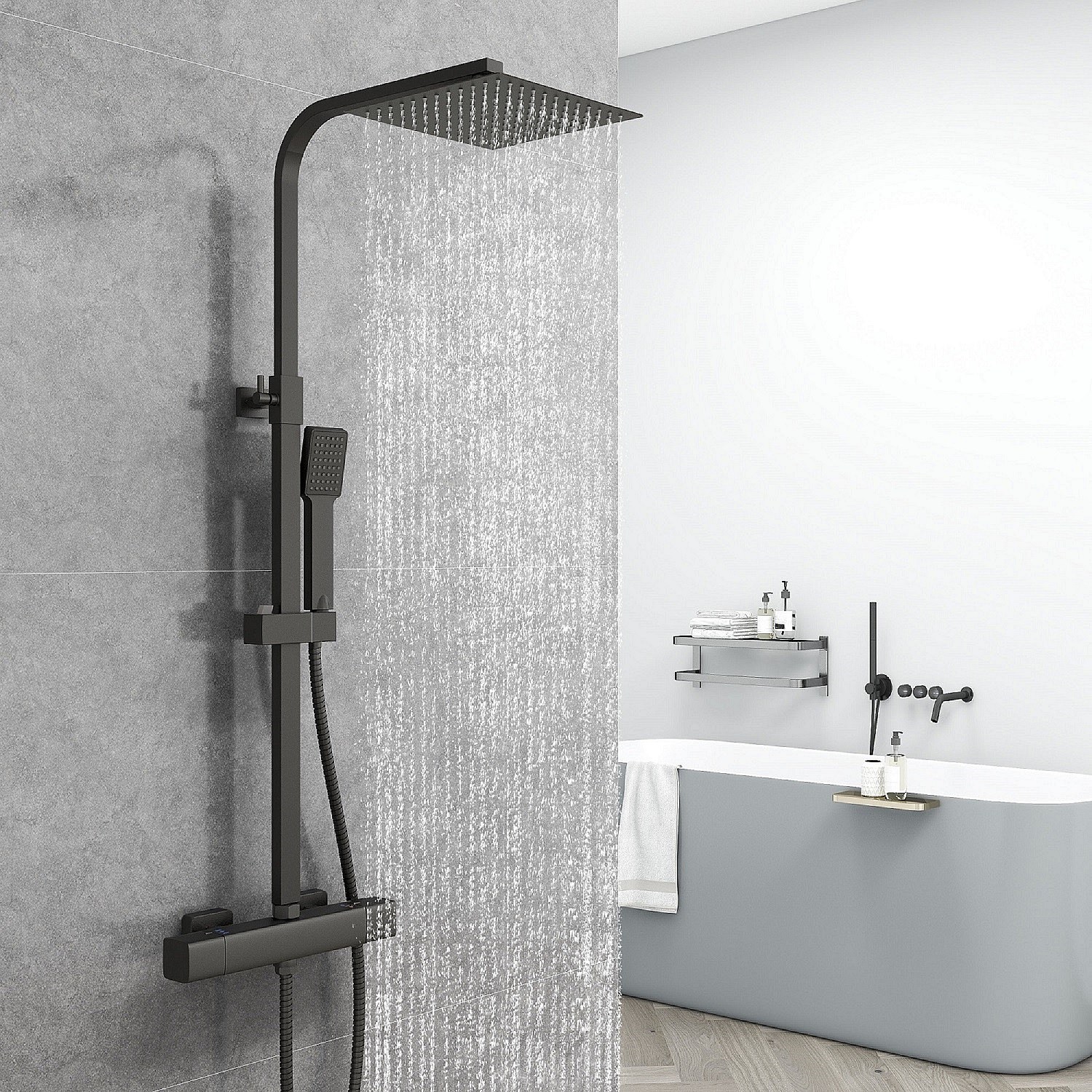 AICA Coluna de duche termostática preto mate | Alcachofra Praça Grande | Barra ajustável 73-115cm| Sistema de duche superior