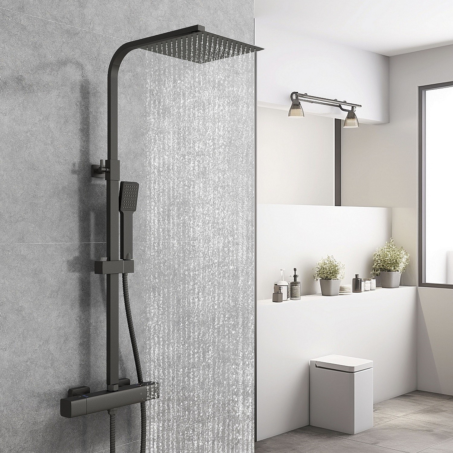 AICA Coluna de duche termostática preto mate | Alcachofra Praça Grande | Barra ajustável 73-115cm| Sistema de duche superior