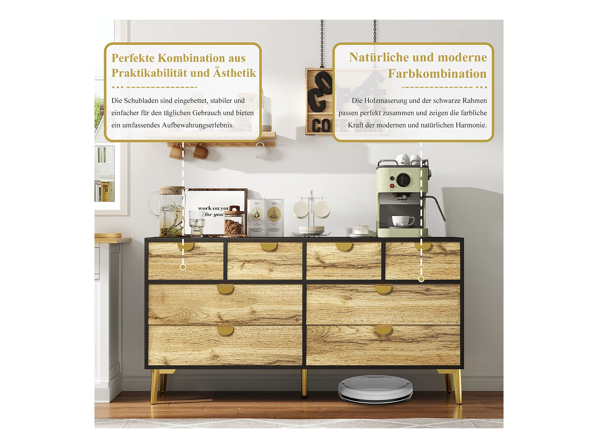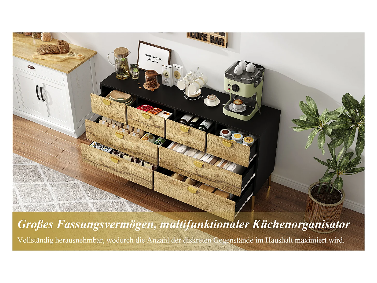 Aparador 150cm MDF 8 gavetas metal preto madeira sala estar sala jantar moderno