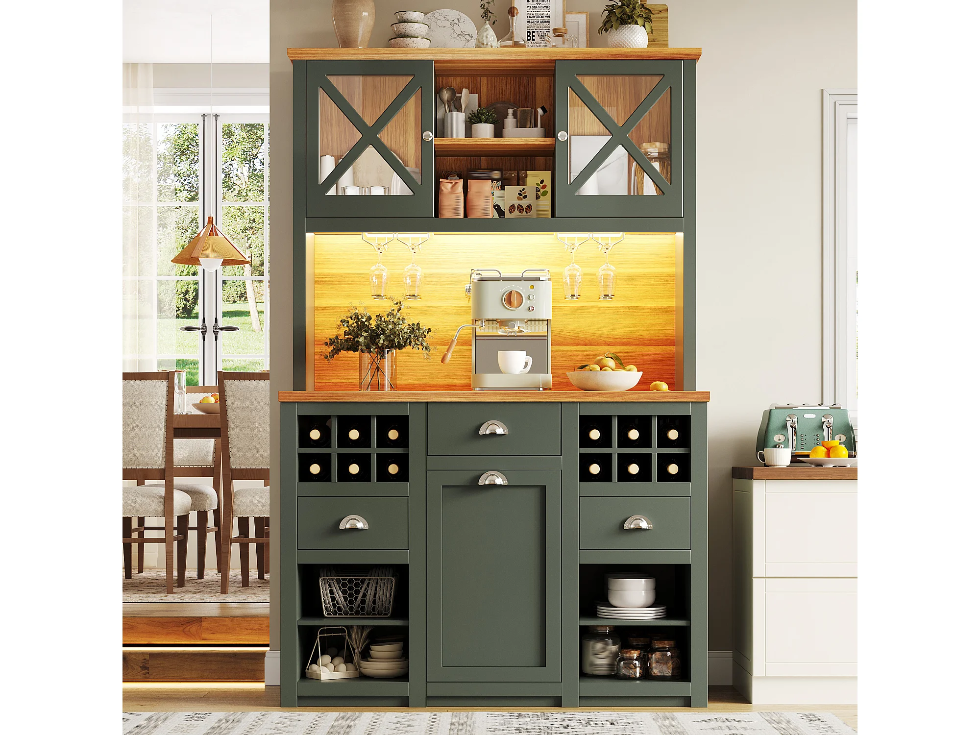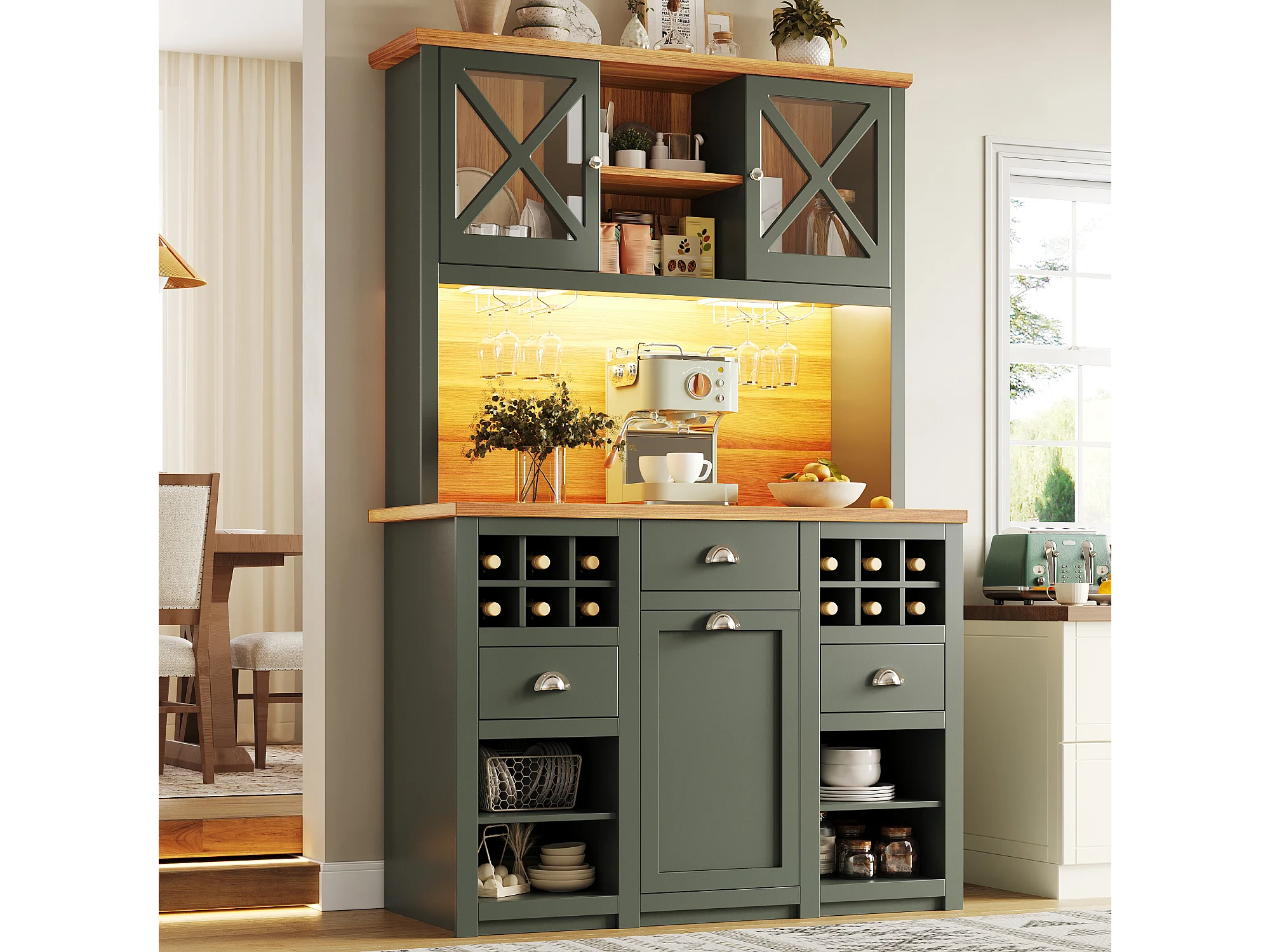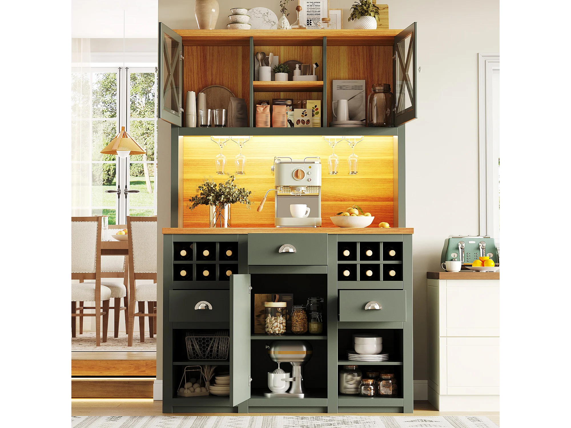 Aparador alto de cozinha - 120 x 45 x 188 cm - com portas de vidro + LEDs + adega + gavetas - MDF + vidro - verde