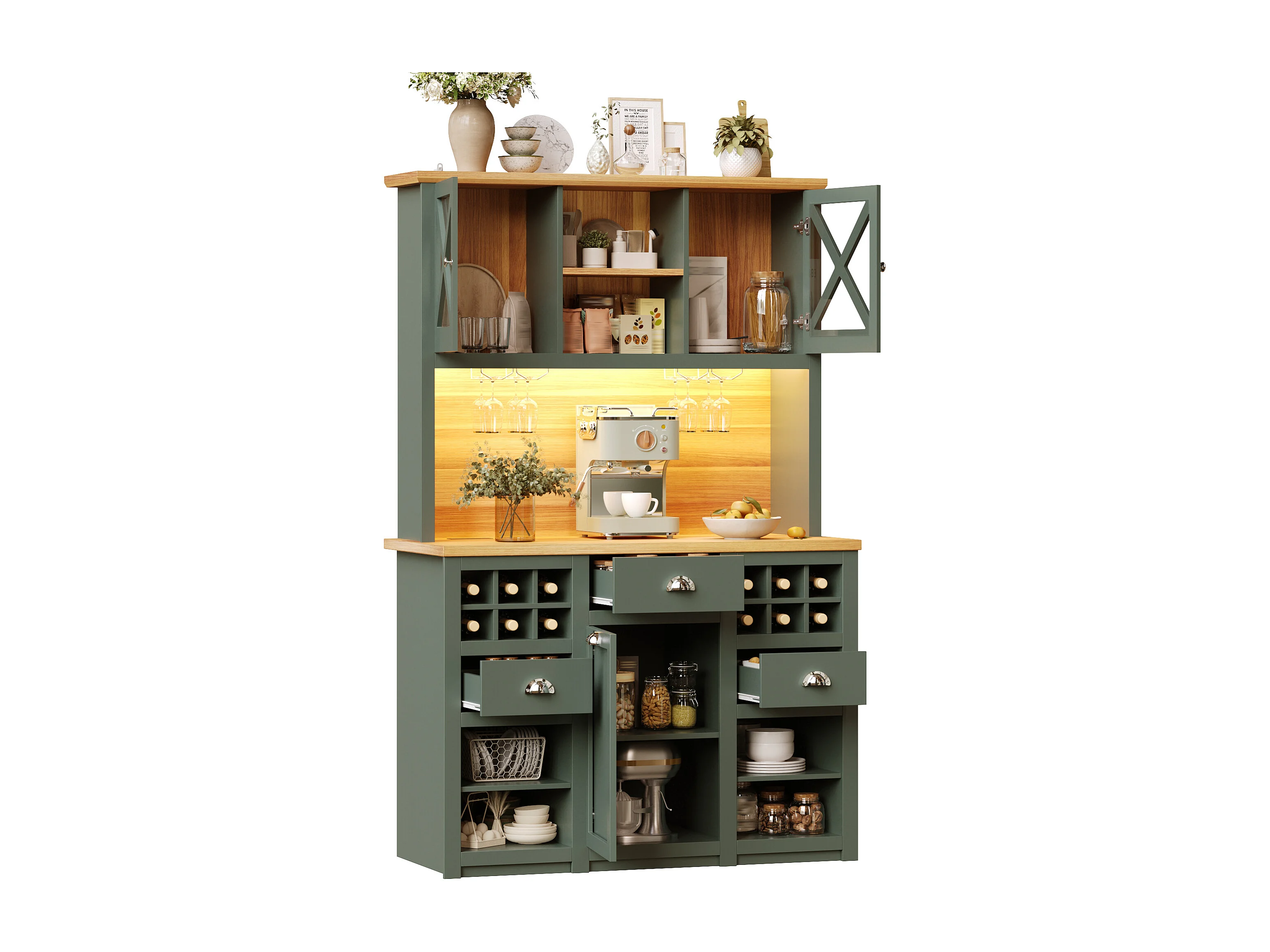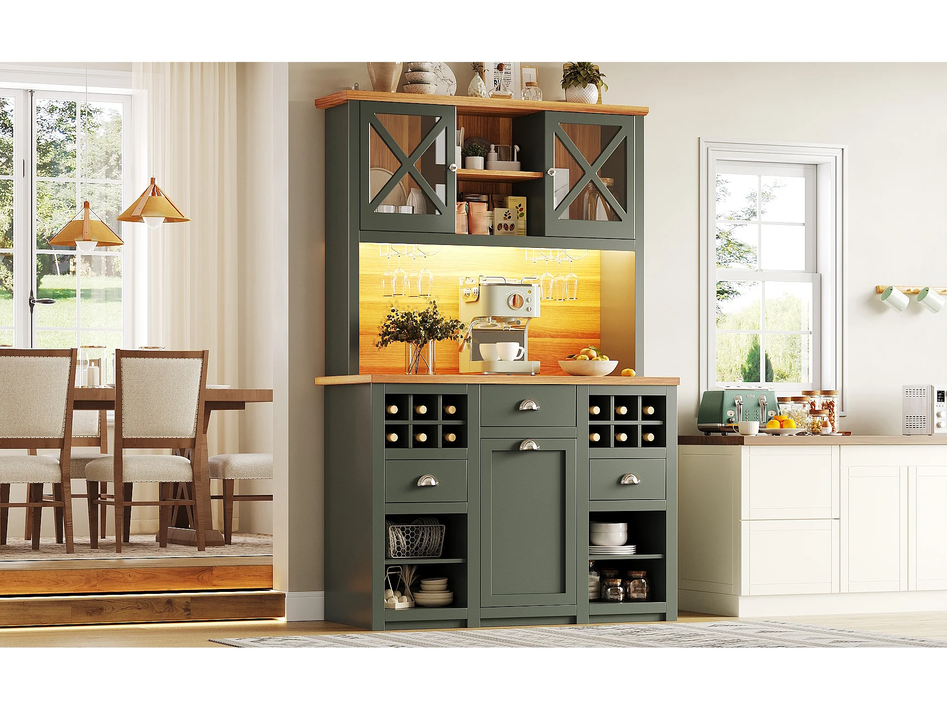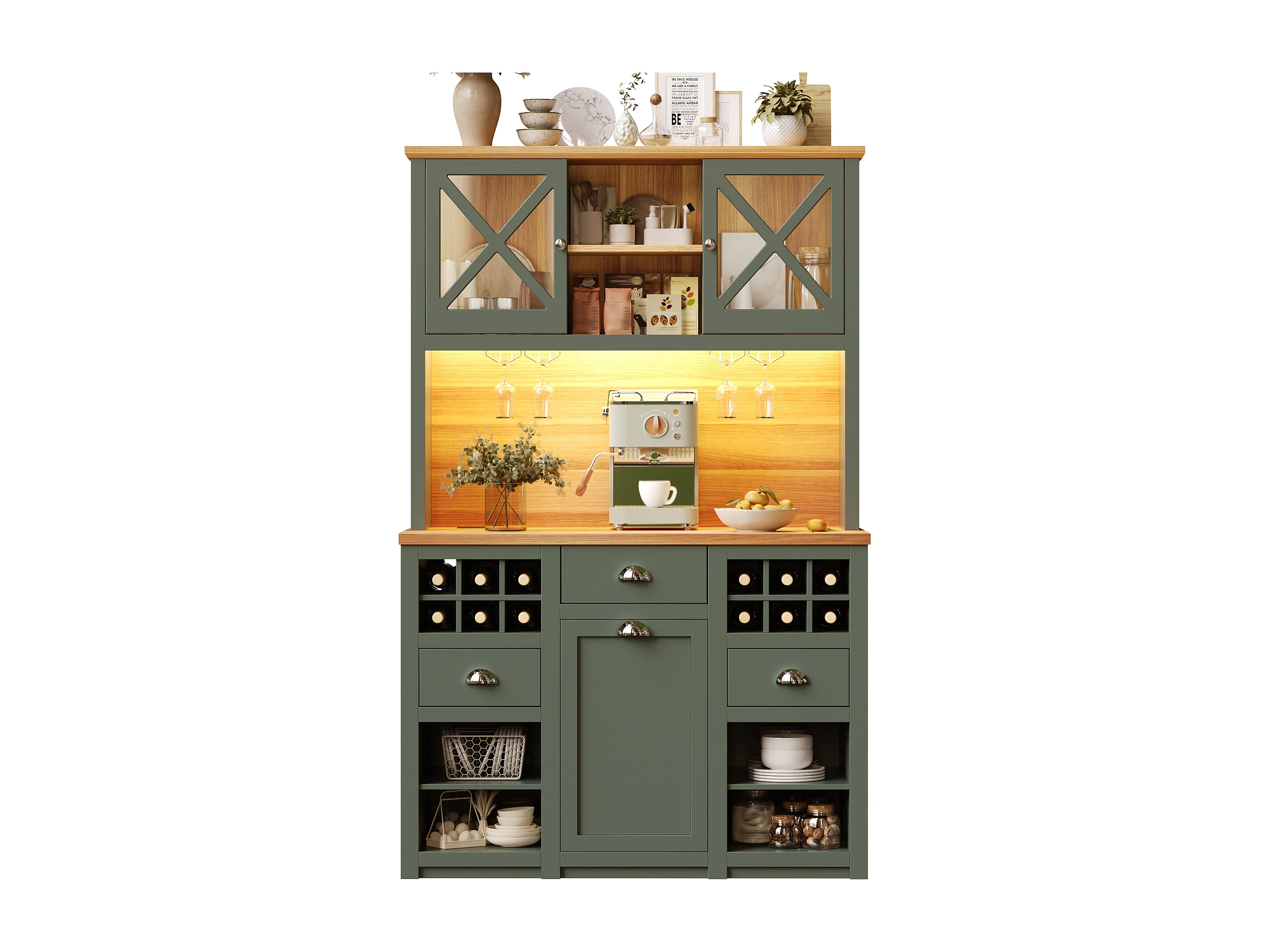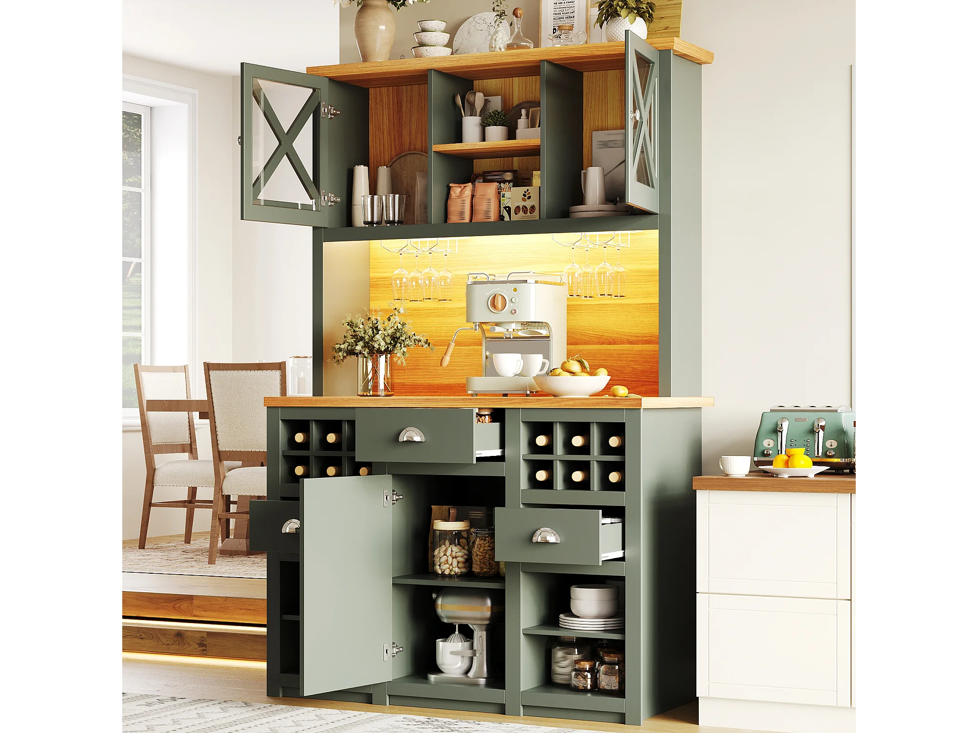 Aparador alto de cozinha - 120 x 45 x 188 cm - com portas de vidro + LEDs + adega + gavetas - MDF + vidro - verde