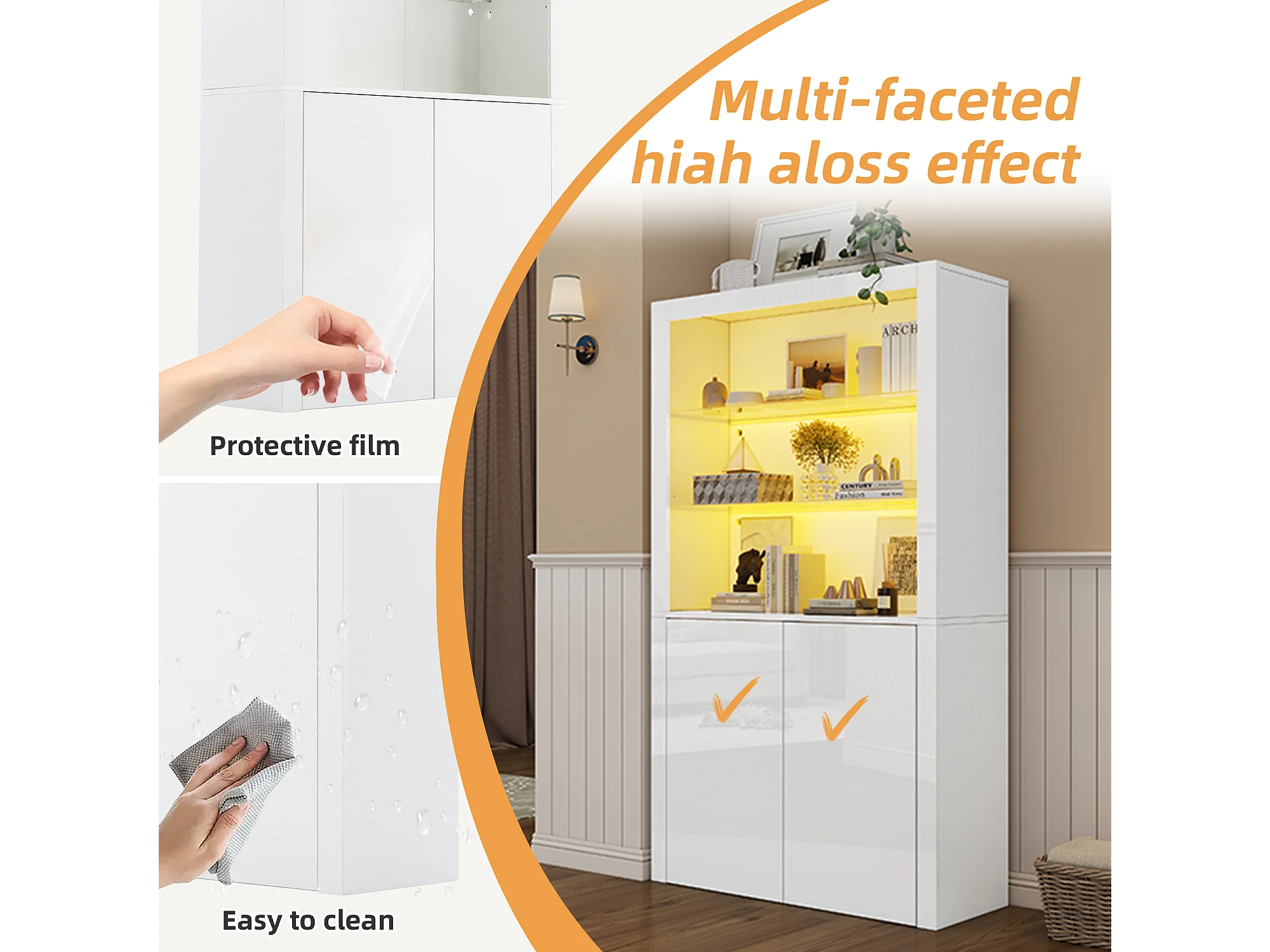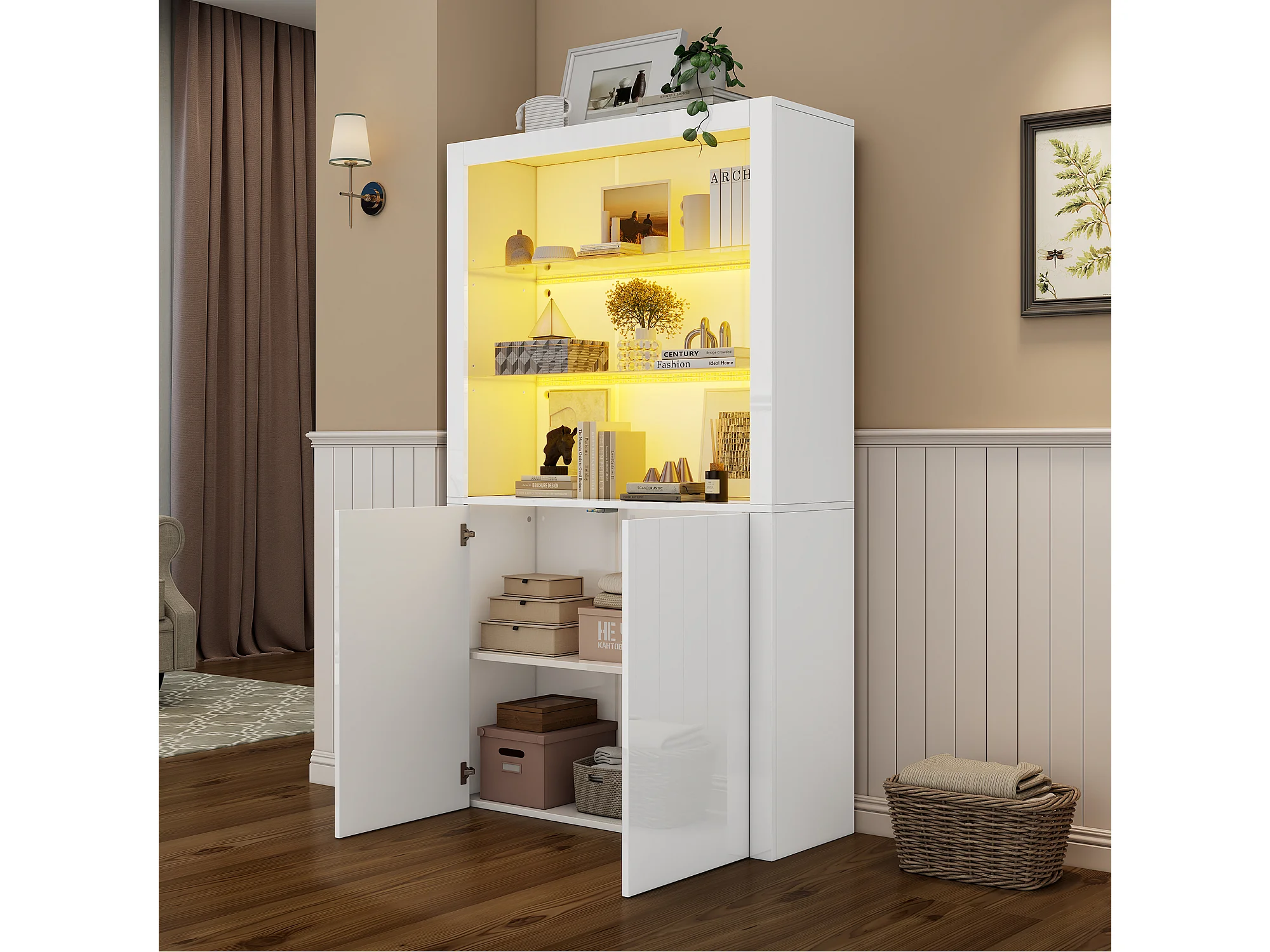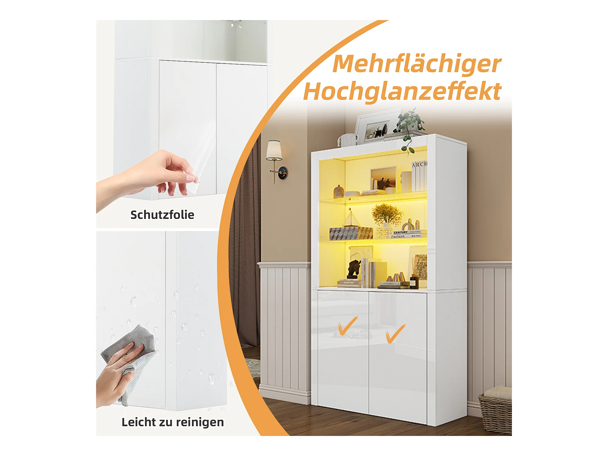 Aparador alto para sala de estar - 100 x 35 x 170 cm - 2 portas + LEDs + tampo de vidro temperado - MDF + vidro temperado - branco