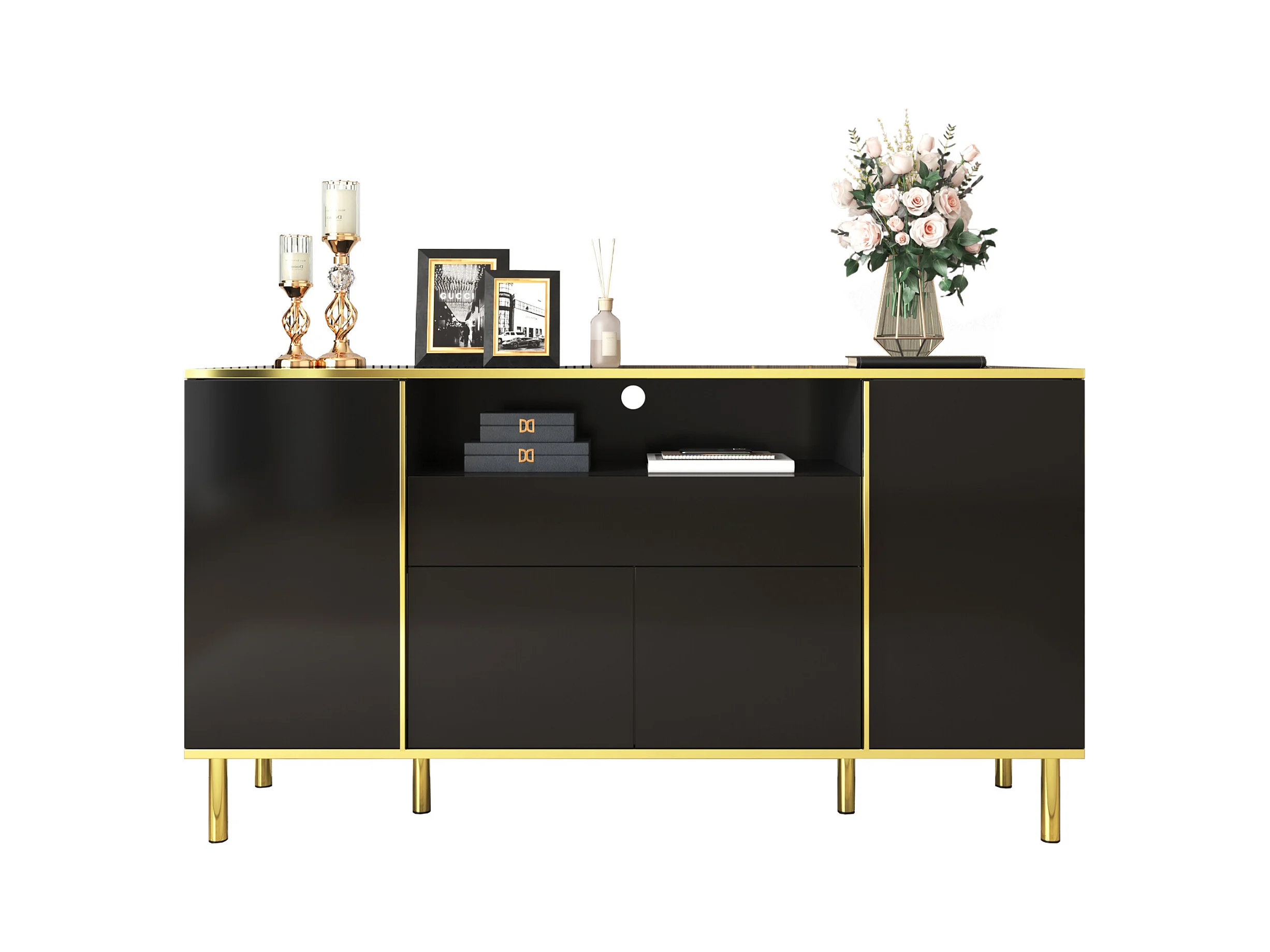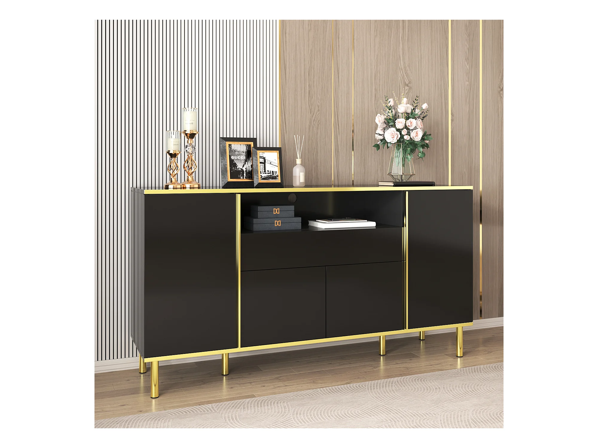 Aparador moderno de 4 portas em preto e dourado - MDF, pés de metal, para sala de estar e sala de jantar