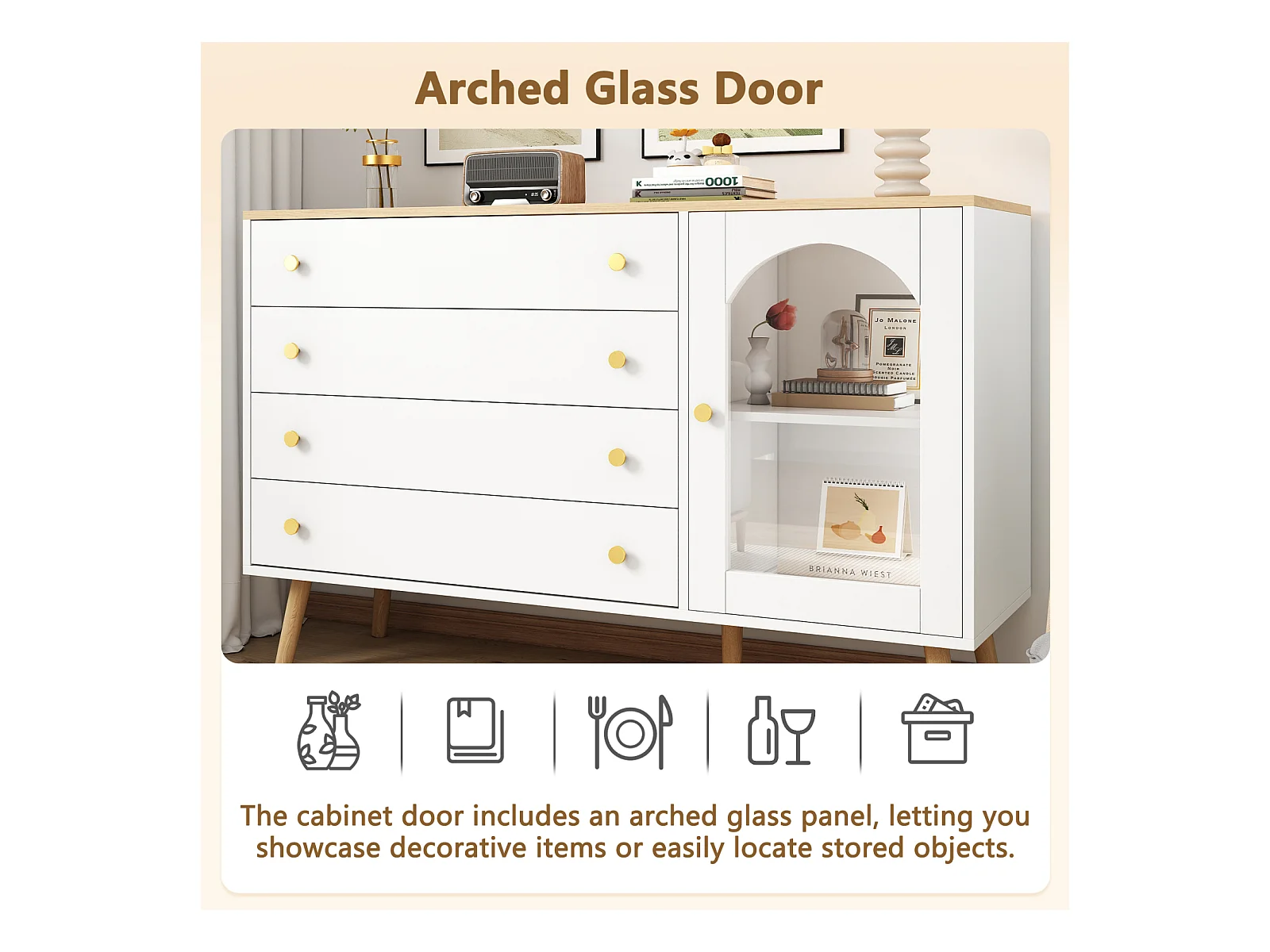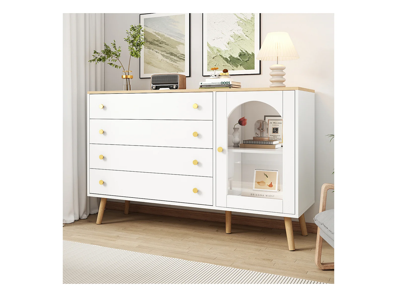 Aparador moderno de 4 portas em branco e dourado - MDF, pés de metal, para sala de estar e sala de jantar