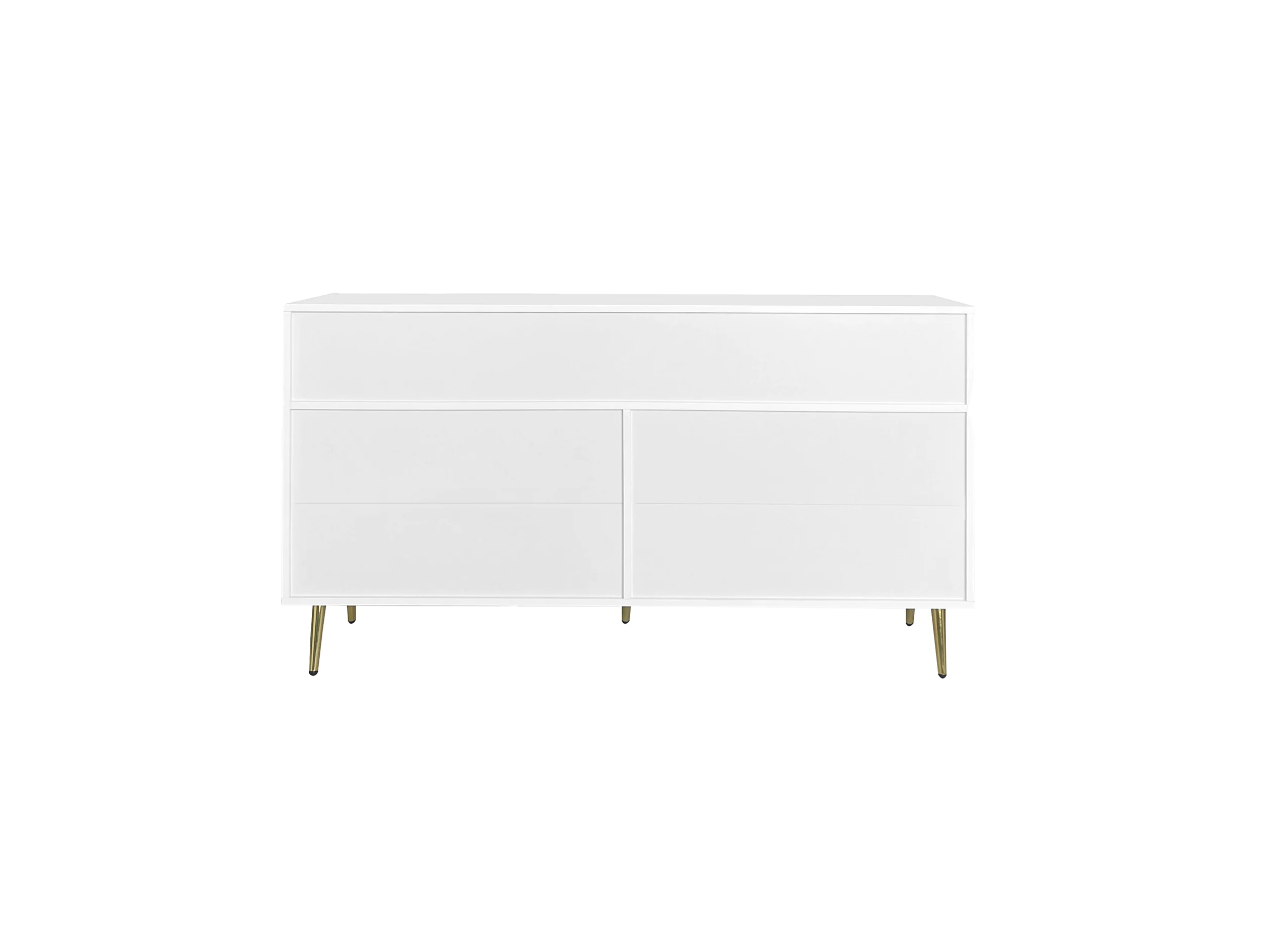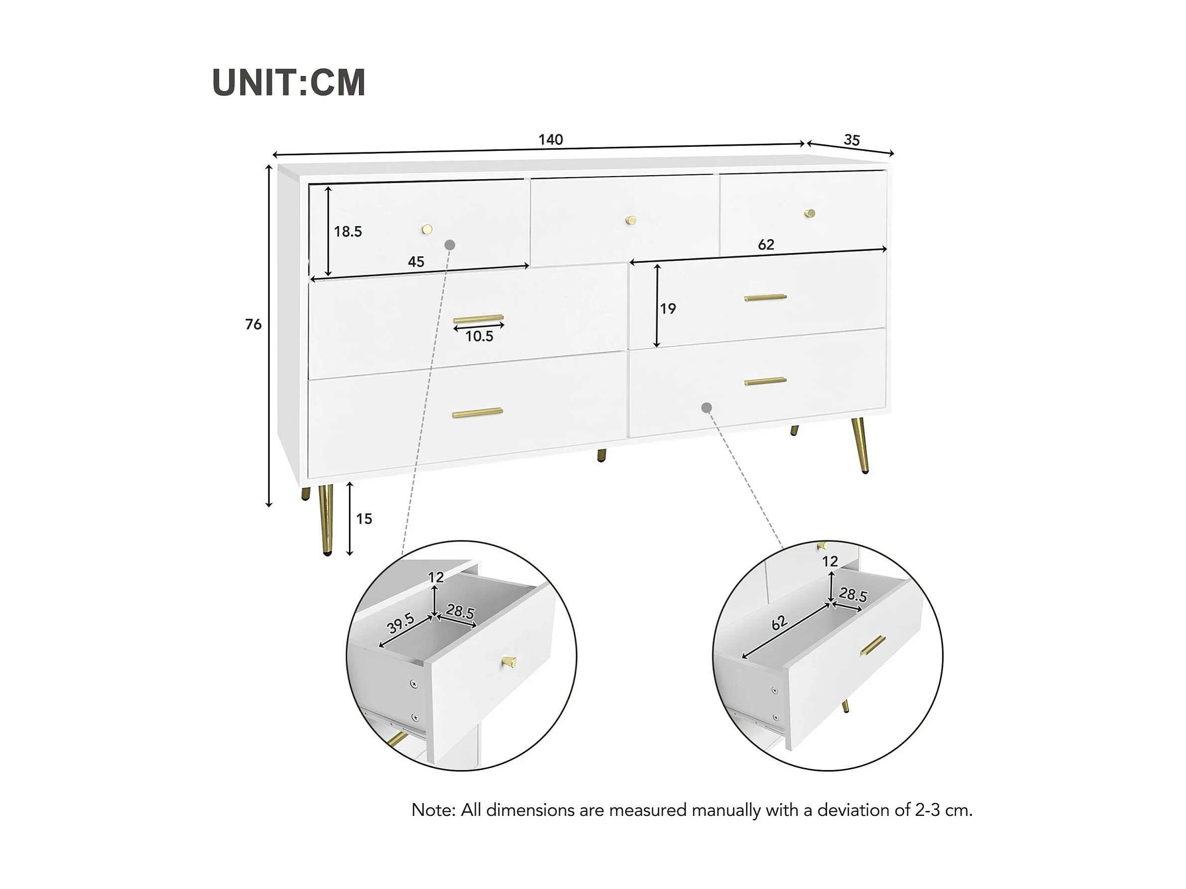 Aparador branco com 7 gavetas, puxadores e pés dourados, 140 x 35 x 76 cm, para cozinha e sala de jantar.