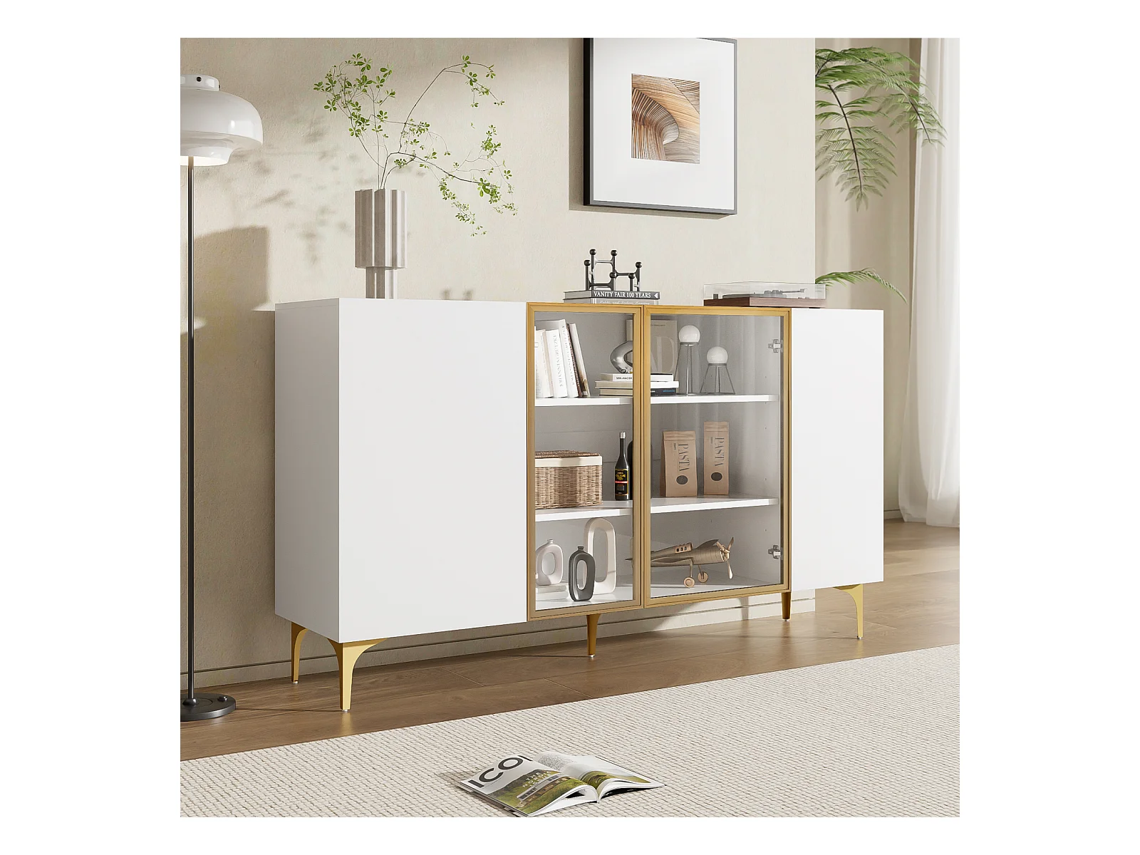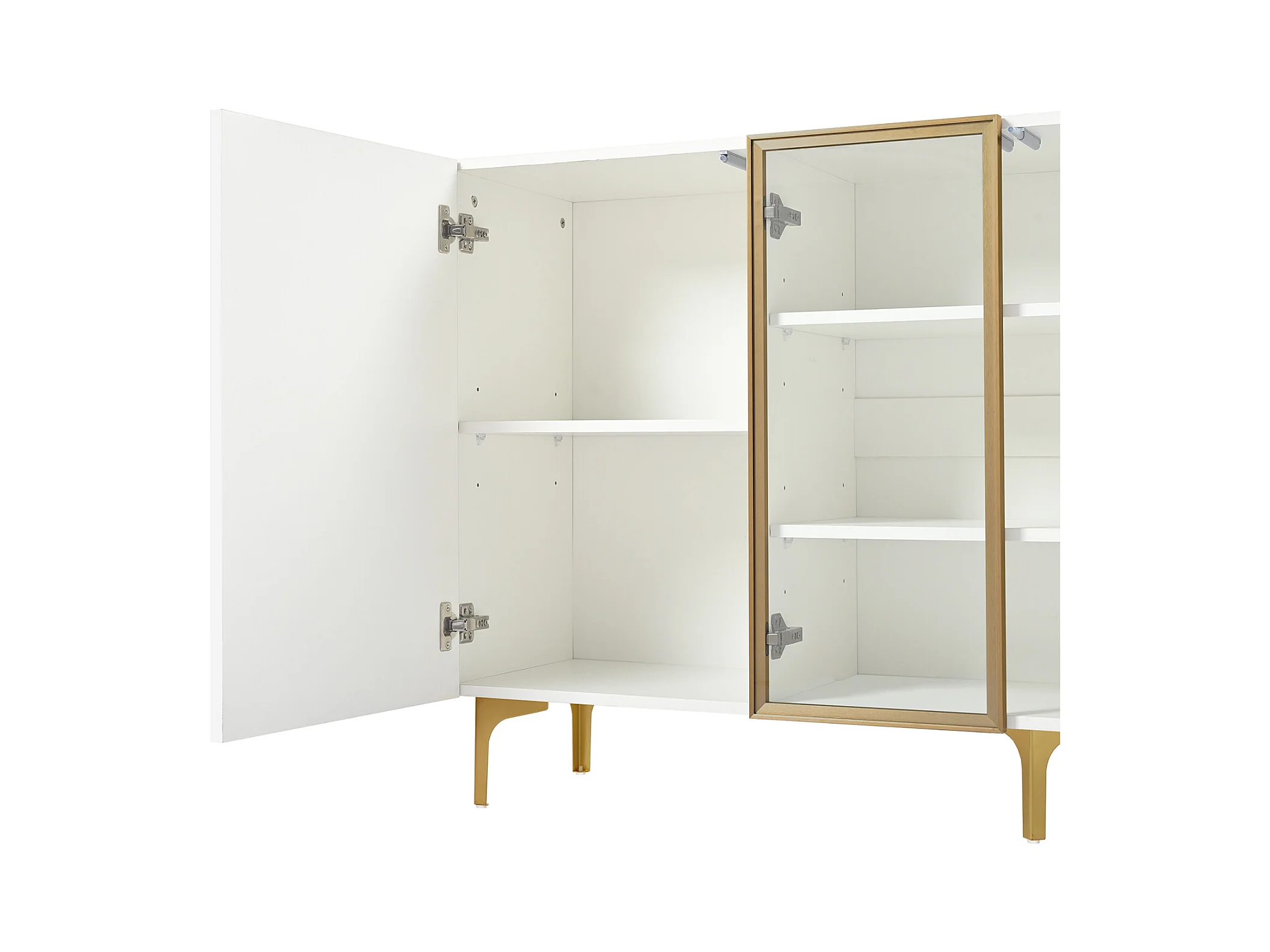 Aparador branco de 4 portas com vidro e metal – Design moderno sem puxadores, amplo espaço de armazenamento
