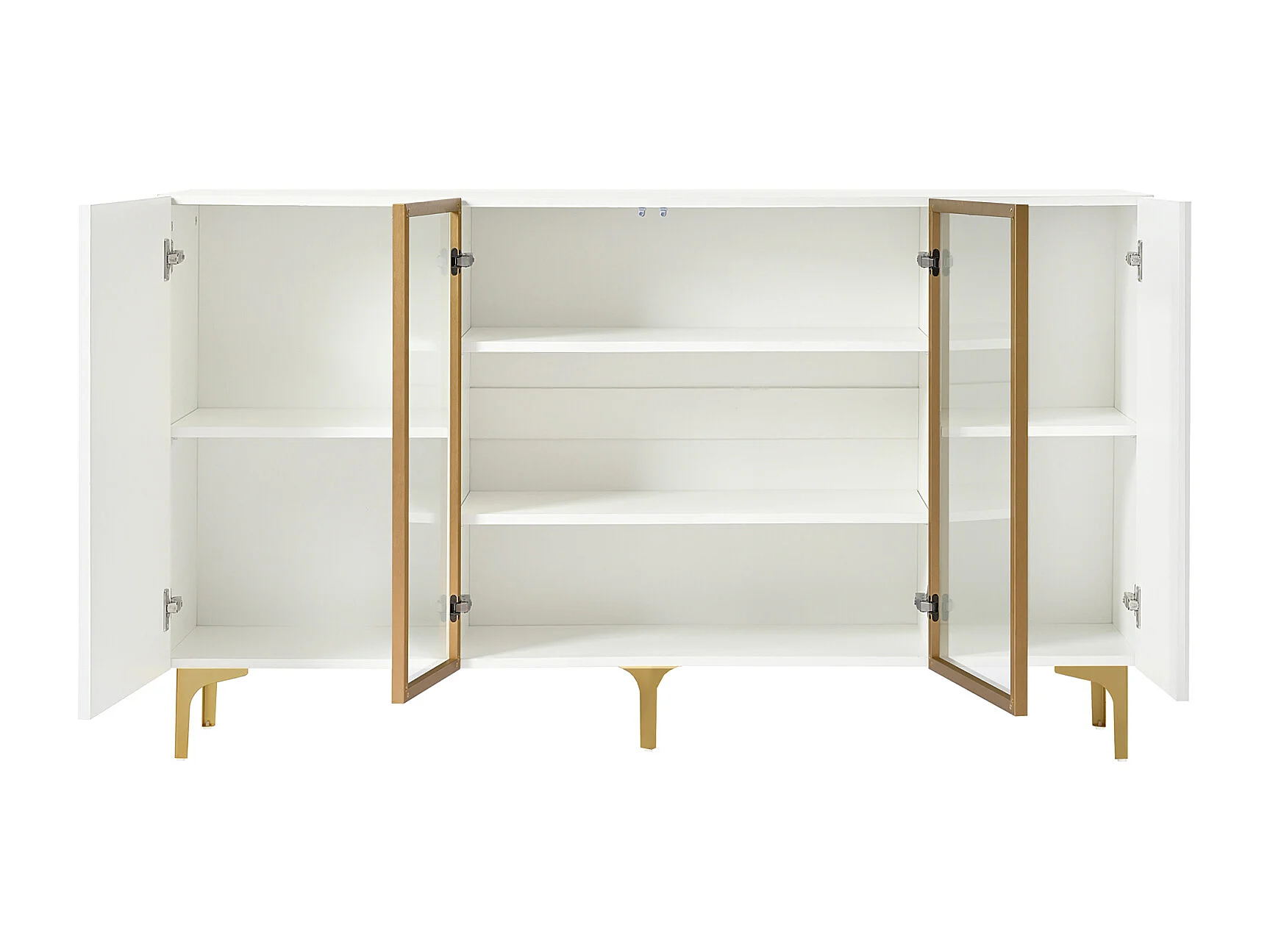 Aparador branco de 4 portas com vidro e metal – Design moderno sem puxadores, amplo espaço de armazenamento
