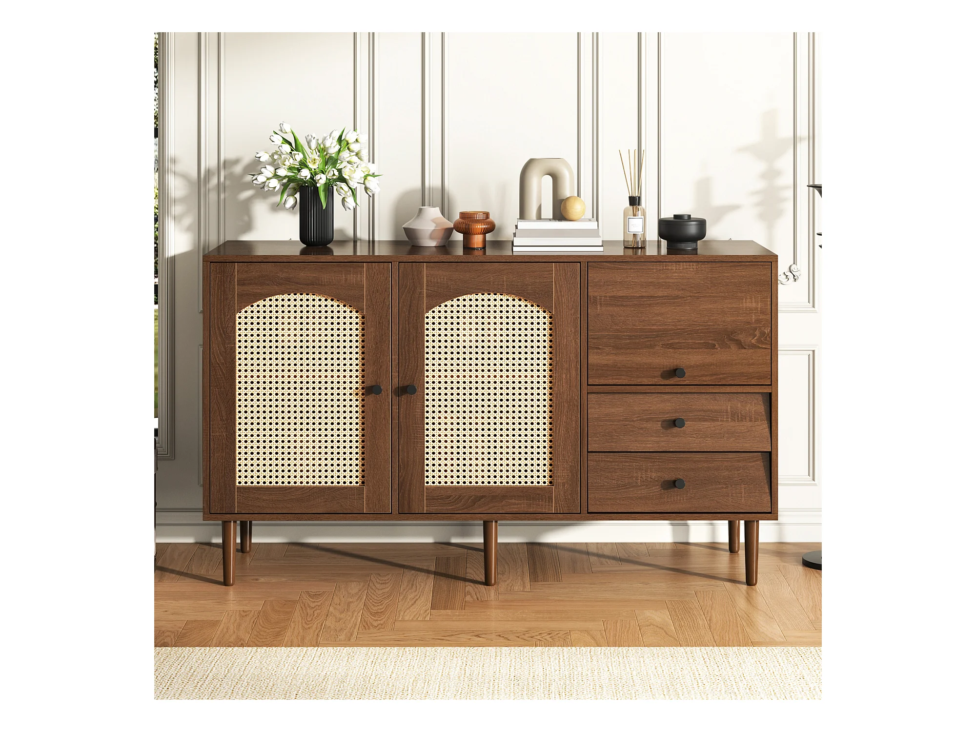 Aparador com 2 gavetas e 2 portas em rattan - 130 x 75,5 x 40 cm - Prateleiras reguláveis - Aglomerado - Cor madeira